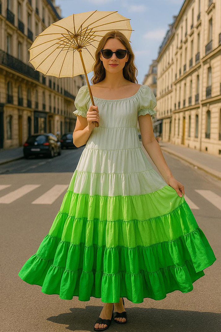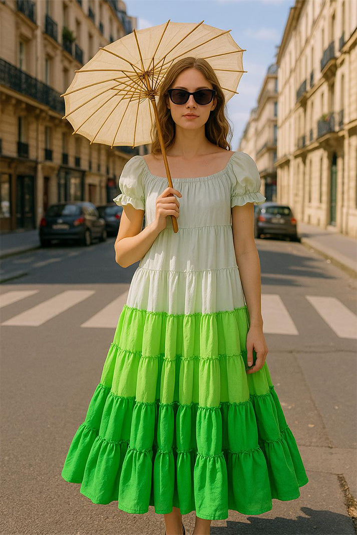 Step into the sunshine with our Lime Sorbet Dress, a dreamy blend of soft mint and zesty green tiers. Featuring a relaxed smocked neckline and puff sleeves, this dress flows with every step — made for strolls under the summer sun.