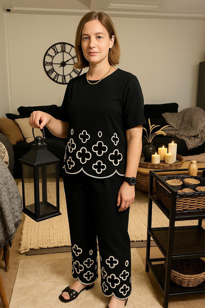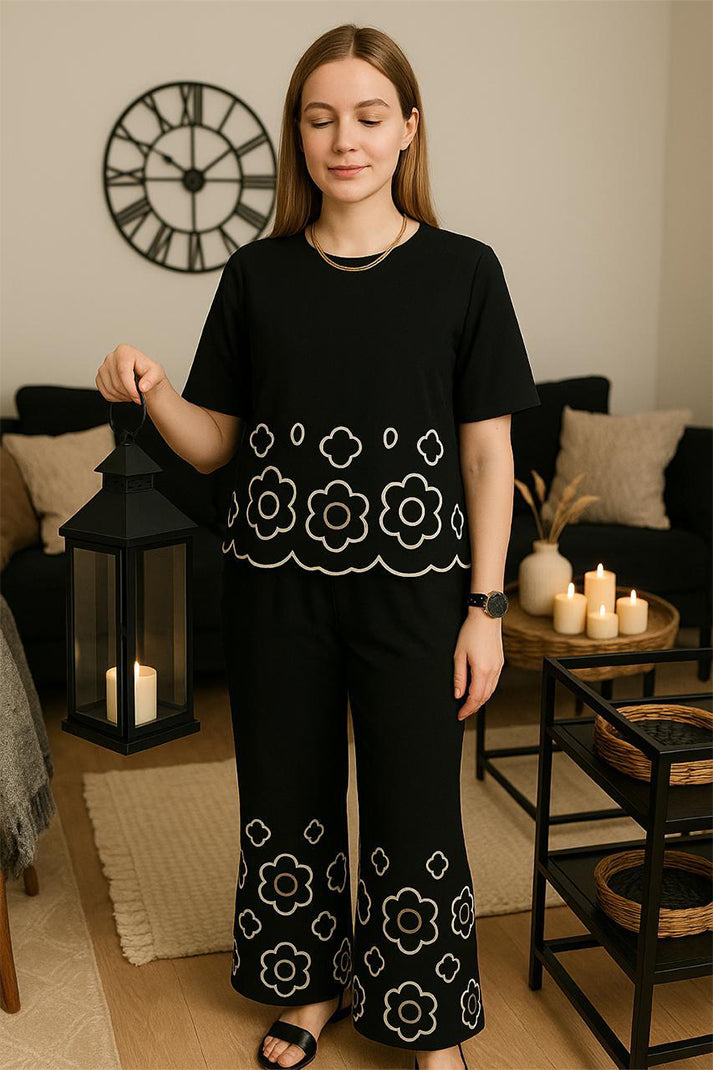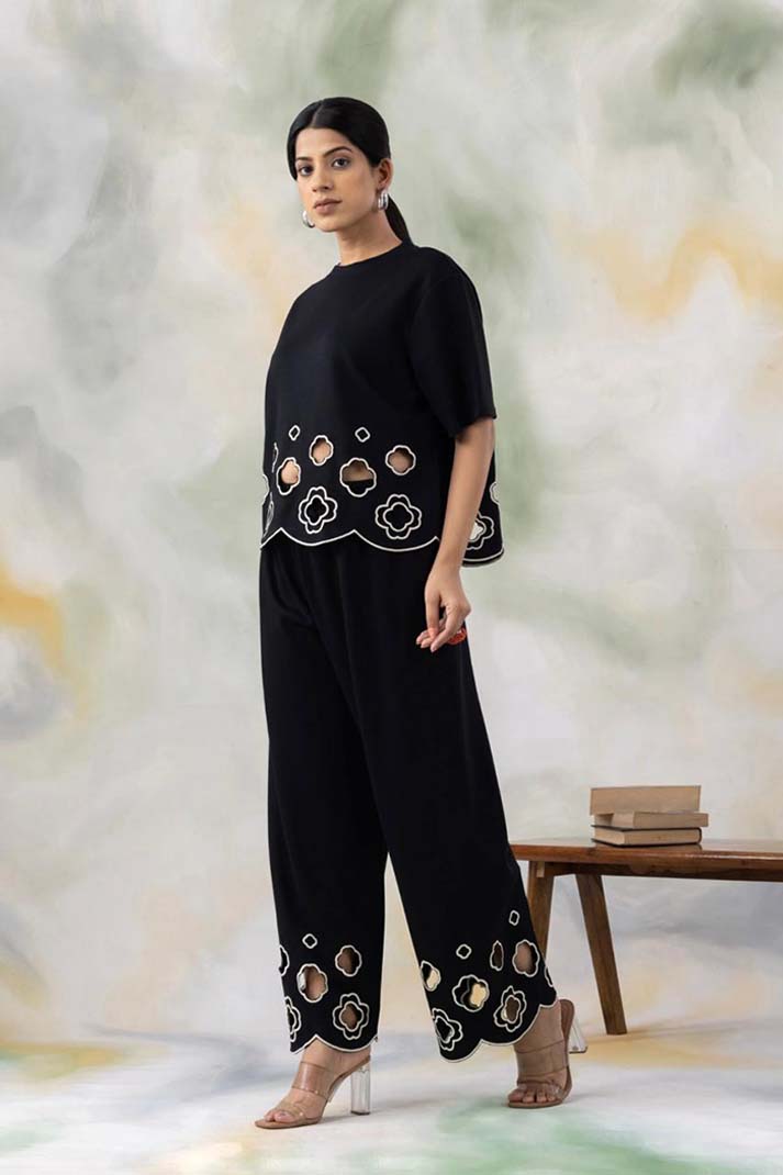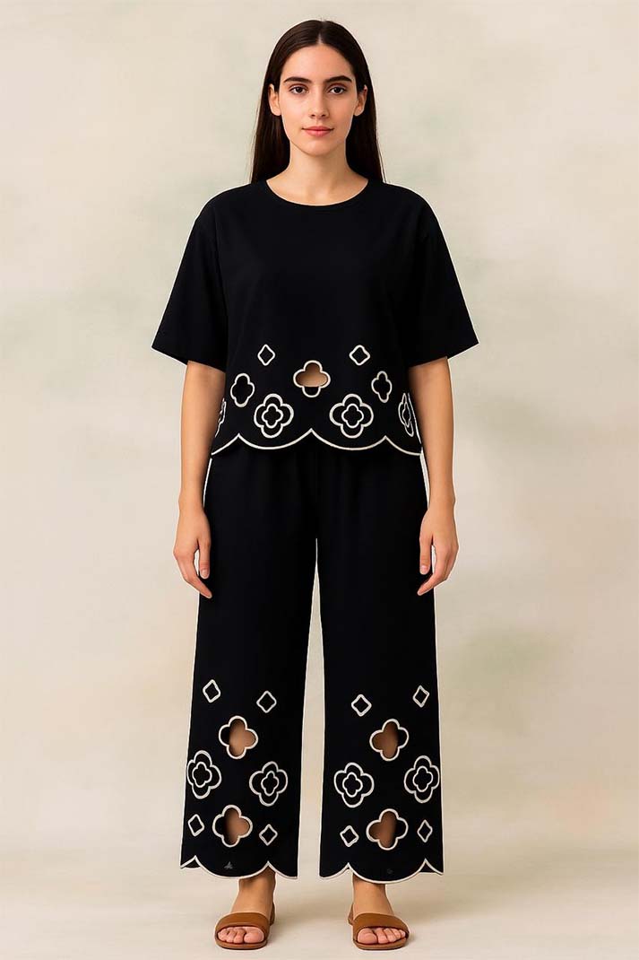 Our Black and Off-White Laser-Cut Co-ord Set is your go-to for relaxed sophistication. Featuring a breezy oversized top with scalloped hem detailing and wide-leg pants adorned with delicate cutwork motifs, this set redefines minimal chic. Crafted from premium breathable fabric, it's perfect for casual days, brunch outings, or travel in style.