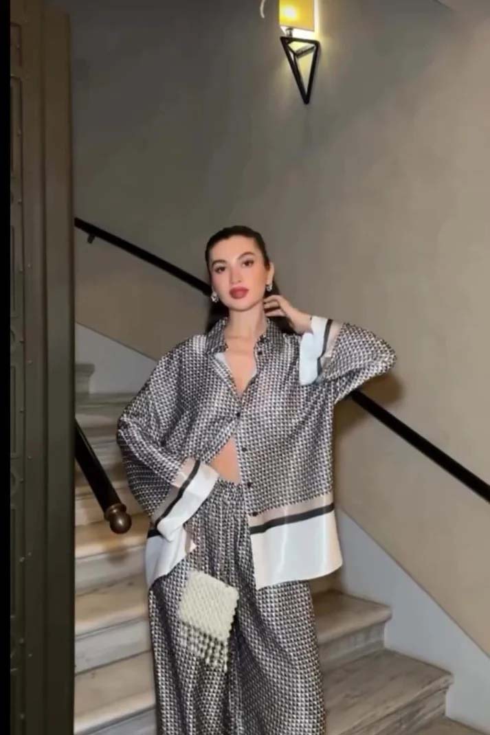 Bold. Effortless. Elevated. The Luxe Geo Set is your go-to two-piece for standout style—featuring a rich geometric print on soft satin-silk, with contrast cuffs and hem for that luxe finish. The relaxed-fit shirt pairs perfectly with wide-leg, elastic-waist trousers for all-day comfort and cool.