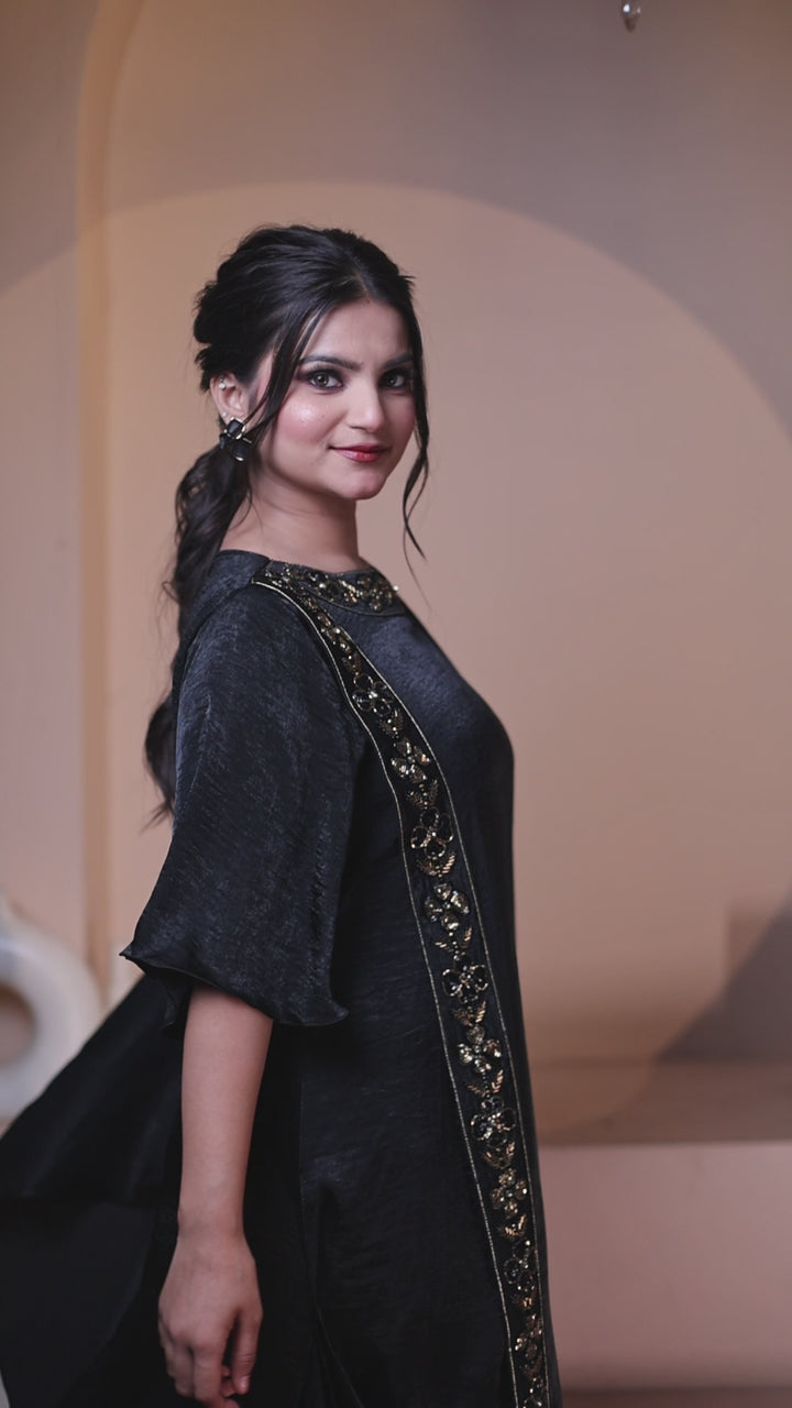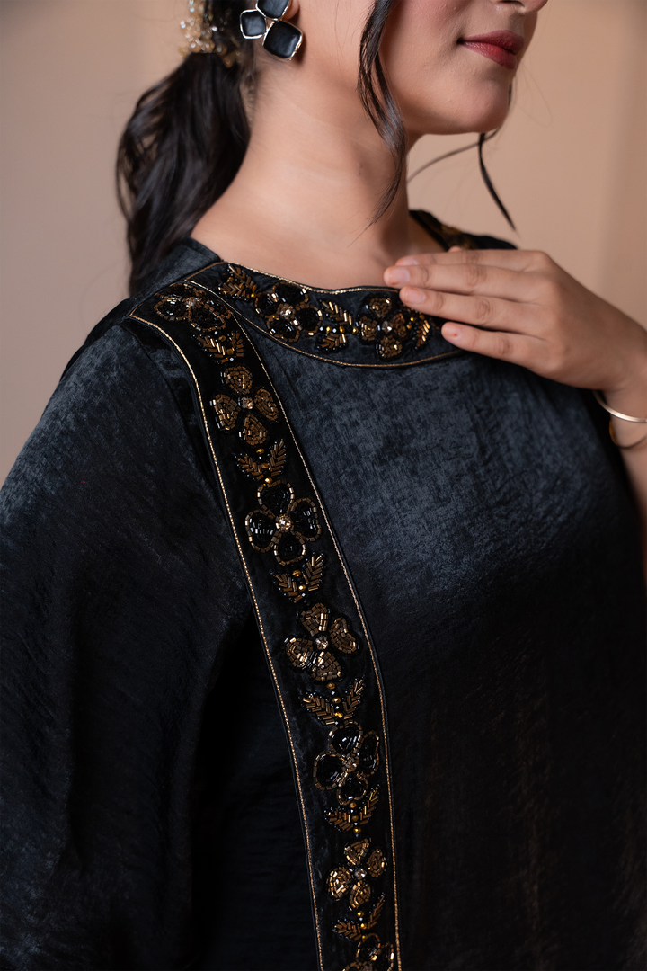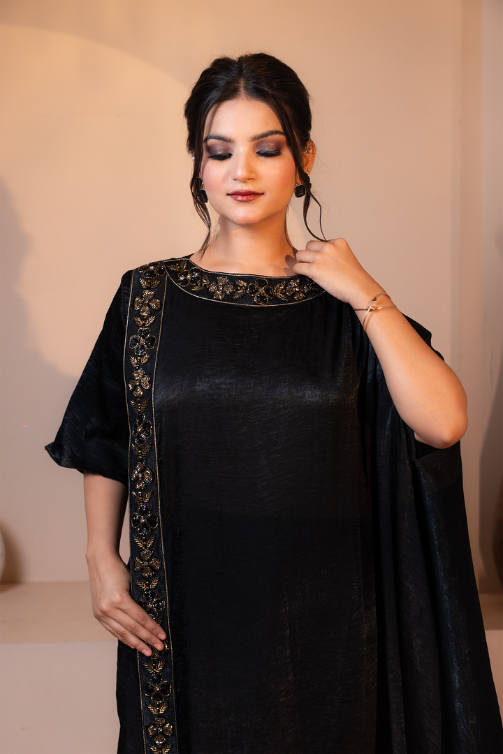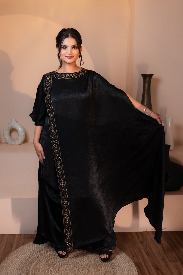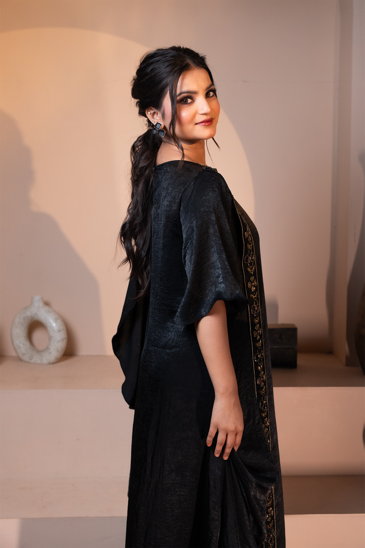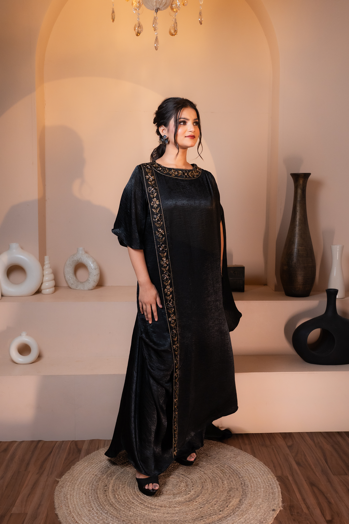 The neckline and front border are delicately adorned with intricate gold embroidery, adding a regal contrast to the deep black base. Its relaxed drape and asymmetric silhouette make it the perfect blend of comfort and couture.