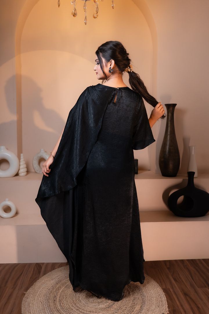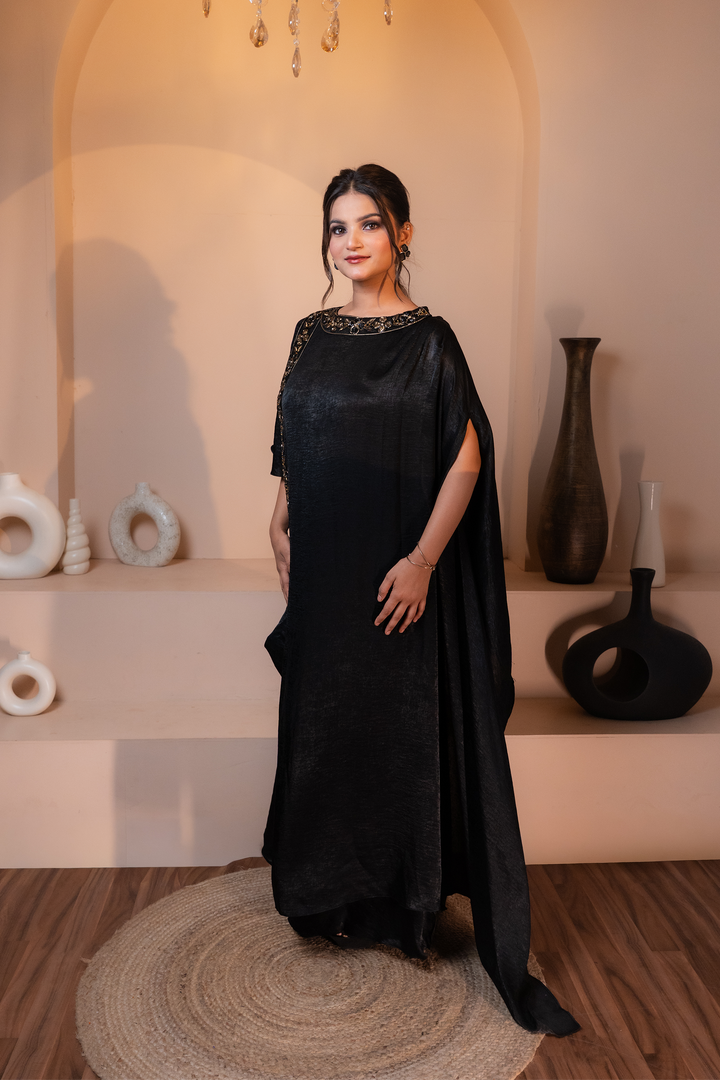 Where fluid grace meets quiet grandeur — Midnight Aura is a vision in black. Crafted from a lustrous soft-silk blend, this kaftan-style dress flows effortlessly with every movement, capturing light in the most mesmerizing way.