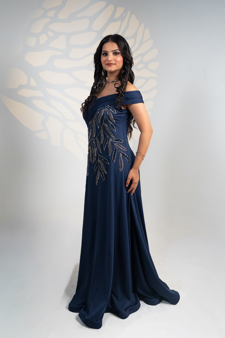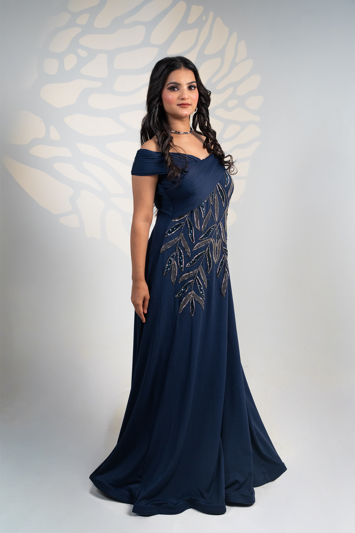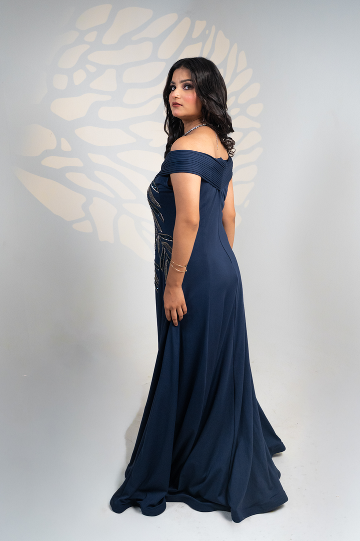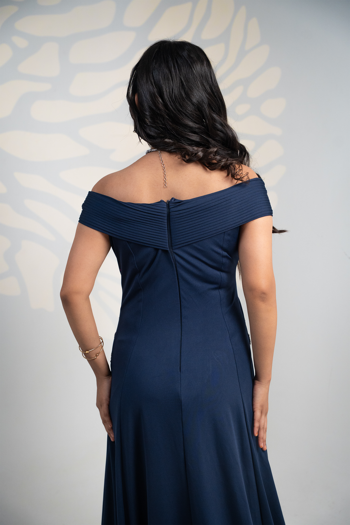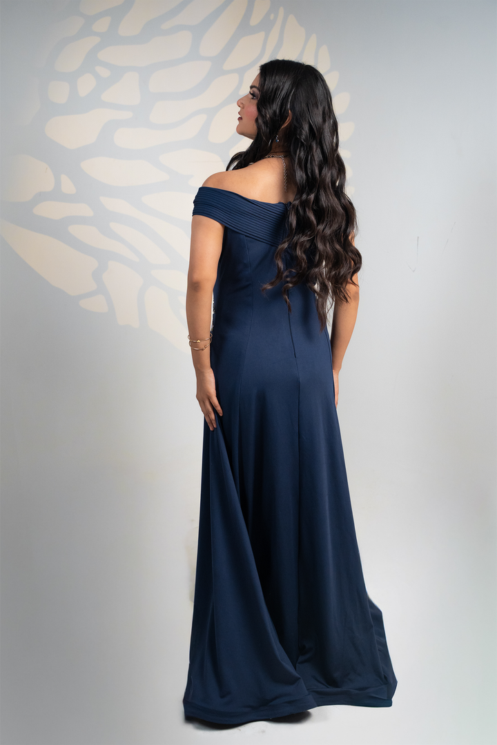 Exude elegance with our Midnight Navy Gown, a luxurious evening ensemble designed to make every occasion unforgettable. Crafted in a rich maroon hue, this gown features a structured pleated off-shoulder neckline that beautifully frames the shoulders and collarbone, adding a touch of sophistication.