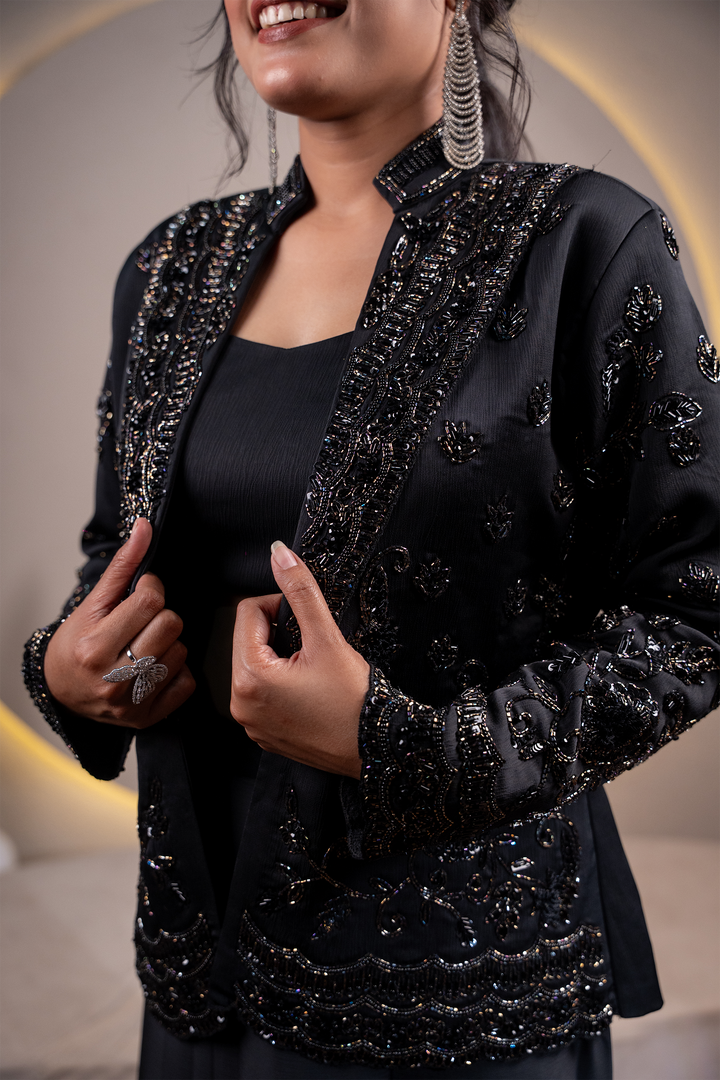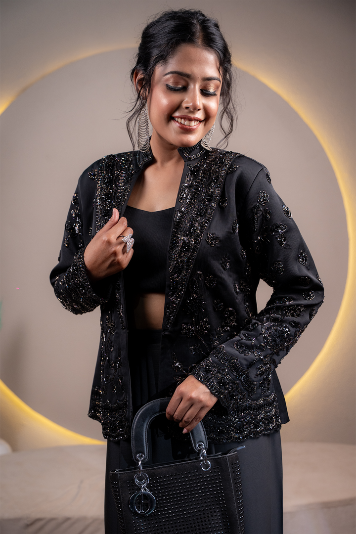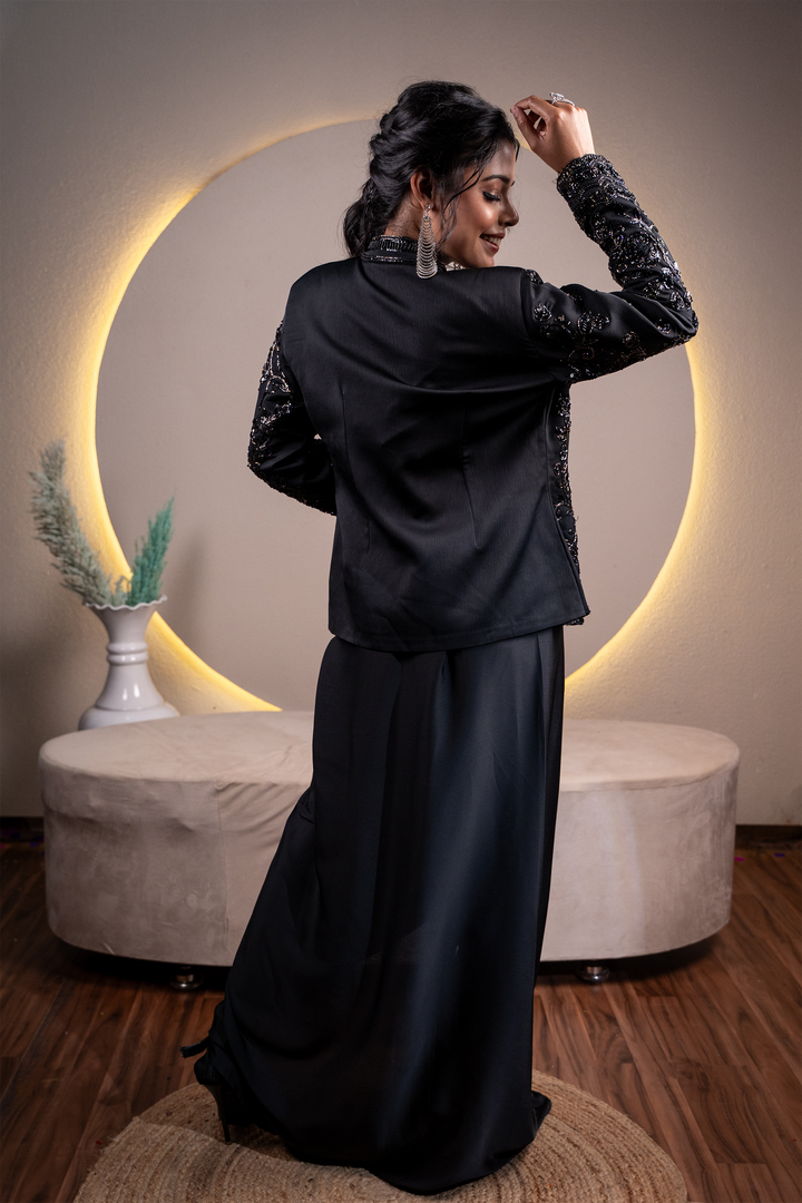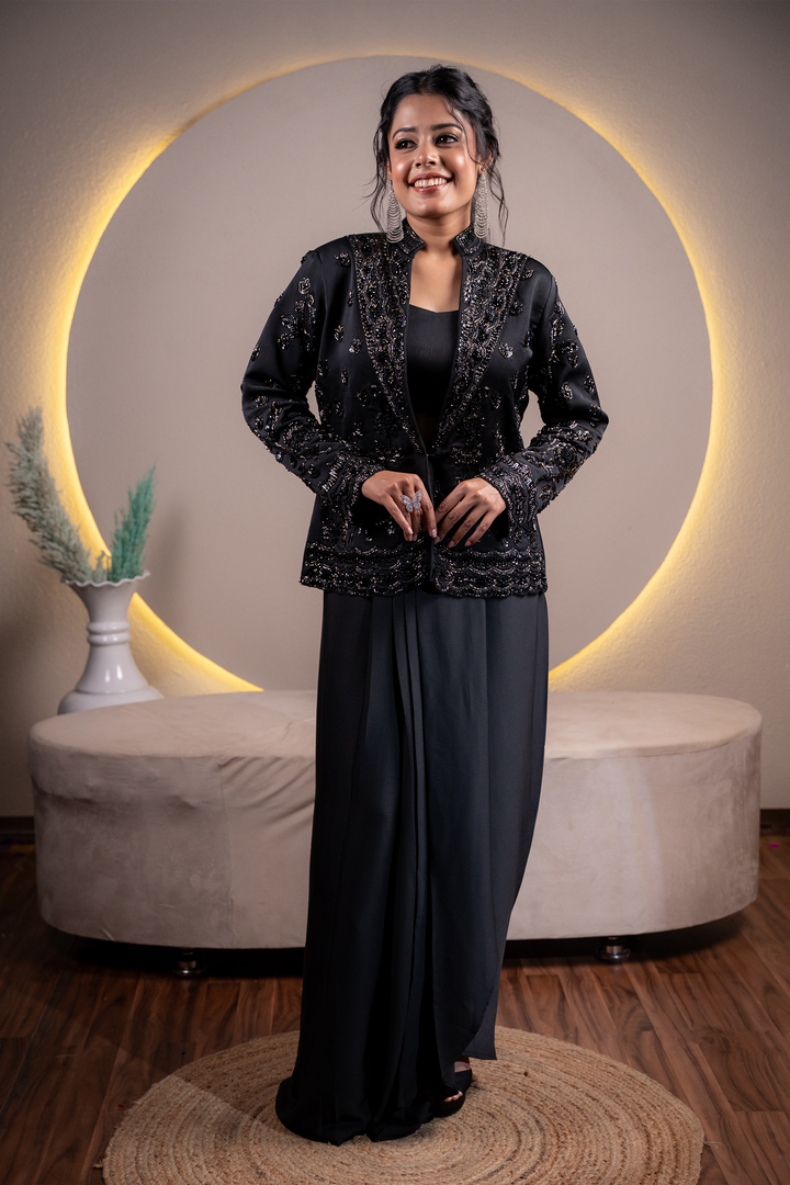 This statement set features a beautifully hand-embroidered blazer, a minimalist crushed satin bustier, and a fluid drape skirt. The jacket, adorned with intricate tonal bead and sequin work, catches light with every movement, evoking subtle glamour and strength. The inner bustier keeps the look structured, while the draped skirt adds a graceful flow — blending tradition and modernity seamlessly.