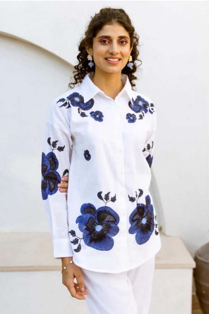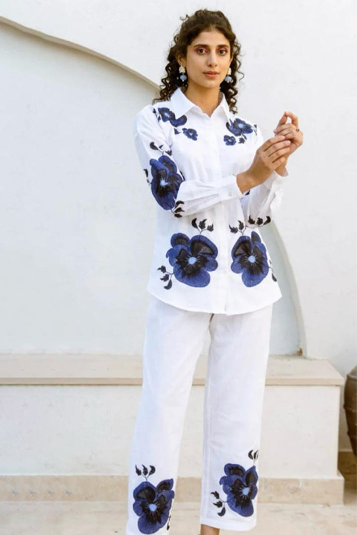 Elevate your everyday elegance with our crisp white cotton co-ord set, delicately adorned with oversized midnight-blue floral embroidery. The collared shirt features full sleeves and a classic button-down silhouette, exuding refined charm. Paired with straight-leg trousers detailed with matching floral motifs at the hem, this set blends timeless sophistication with modern flair. Whether for a brunch, gallery walk, or a serene evening, this ensemble brings a refreshing burst of artistic grace to your wardrobe.