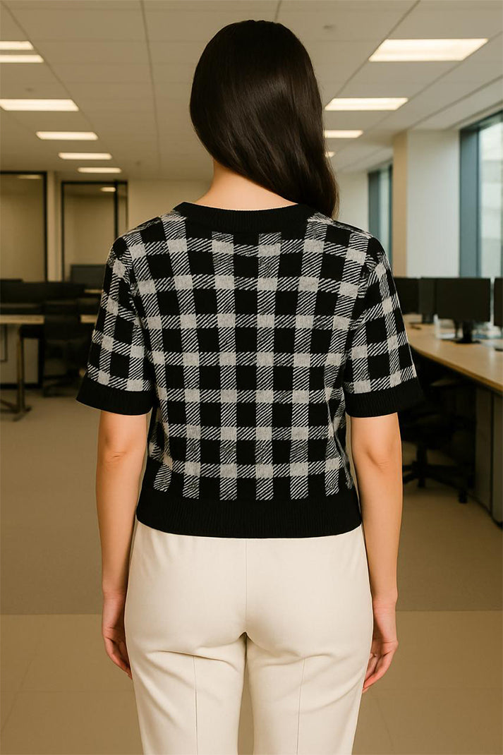 Classic charm meets everyday ease with our Monochrome Muse Knit Top. This effortlessly stylish V-neck short-sleeve top features a timeless black-and-white checkered pattern, crafted in a soft, breathable knit. The structured silhouette with ribbed hems at the sleeves and waist ensures a flattering fit that pairs beautifully with everything from tailored trousers to casual denims.