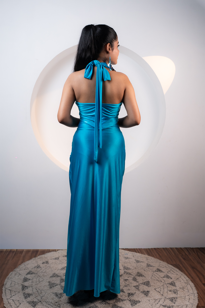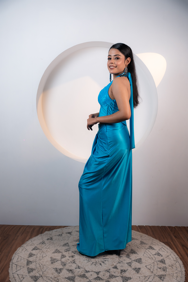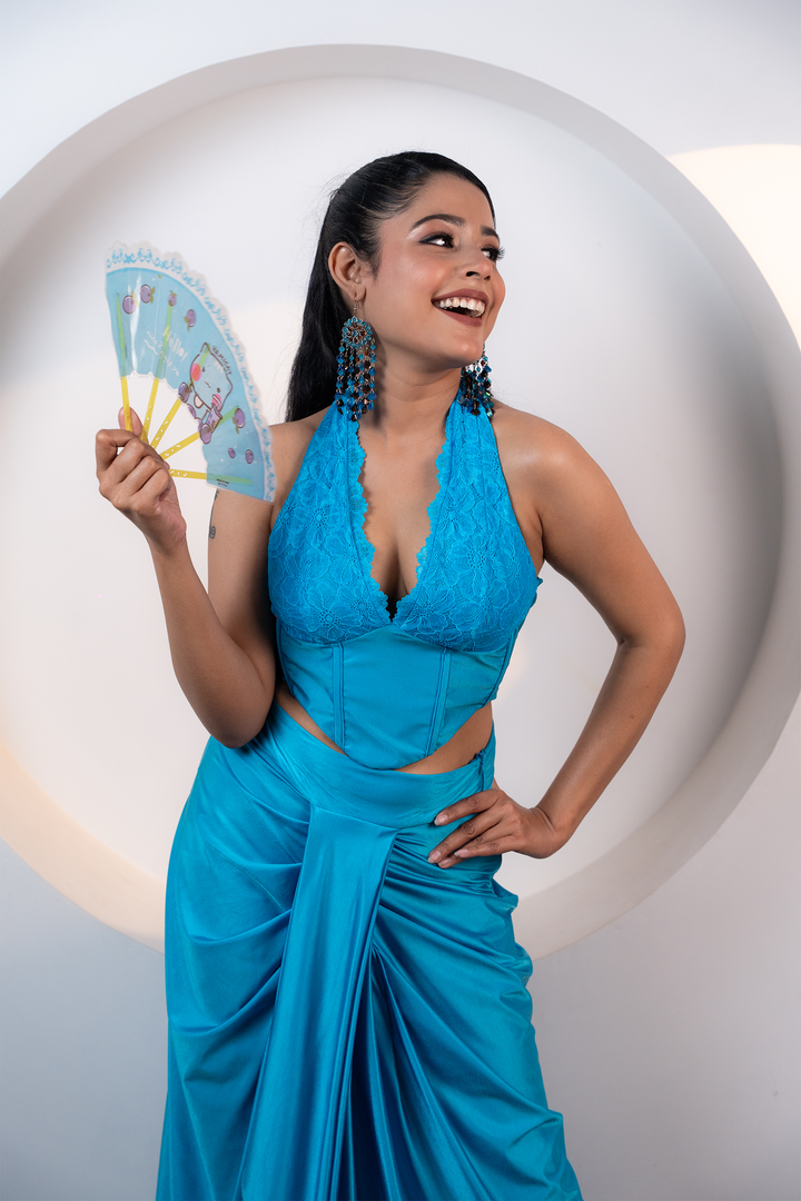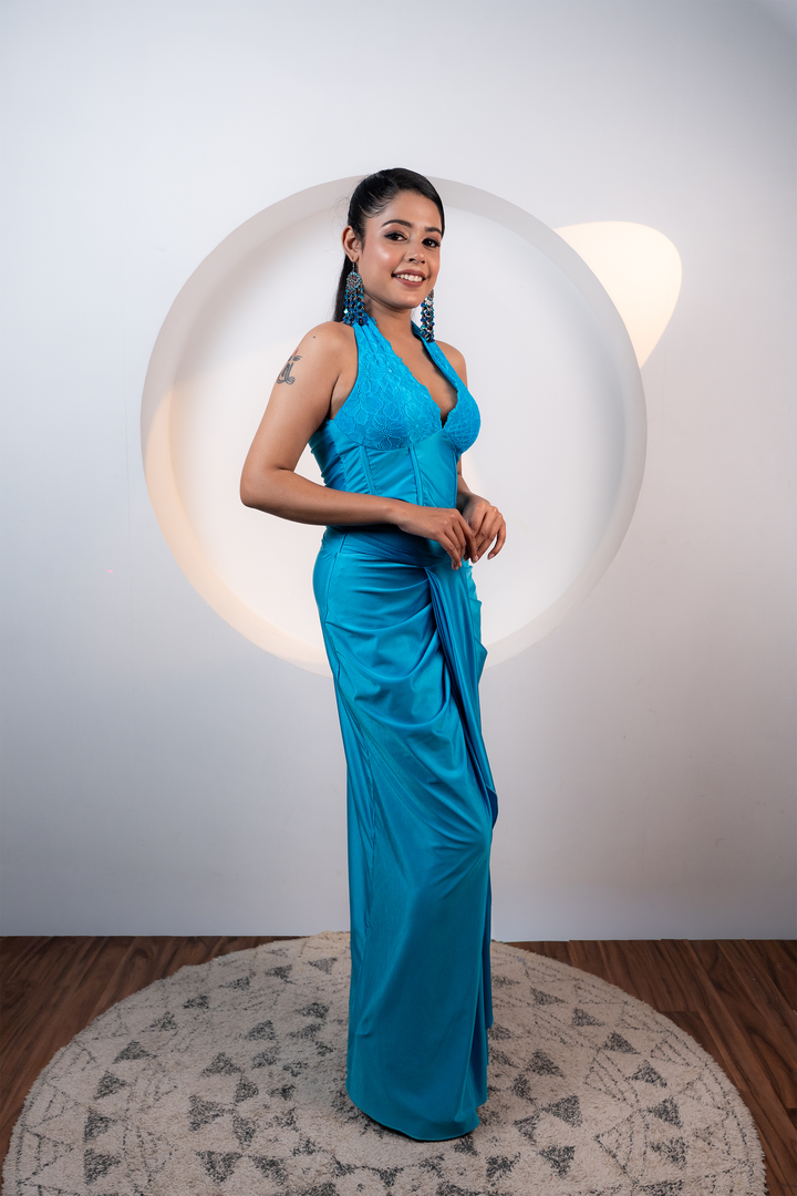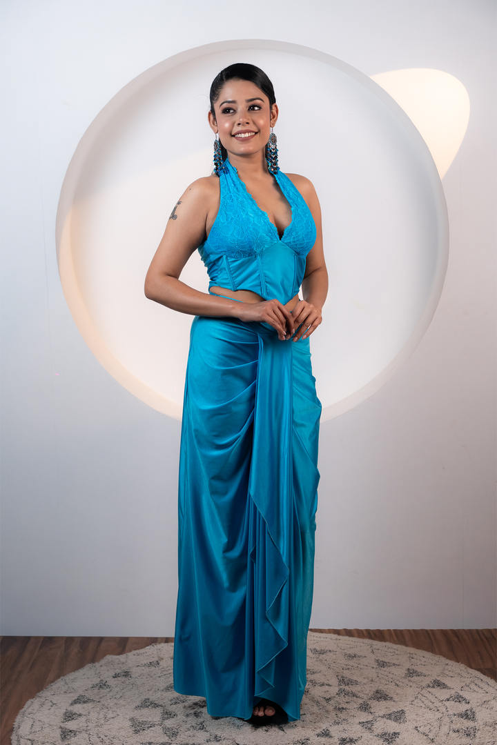 Step into festive radiance with the Noor-e-Neelam, a two-piece ensemble that merges modern silhouettes with regal elegance. Drenched in a rich sapphire-blue hue, this set features a halter-neck corset blouse crafted with delicate lace and structured boning for a flattering fit. Paired with it is a luxe satin-lycra dhoti-style drape skirt that flows effortlessly, creating a dramatic yet graceful statement.