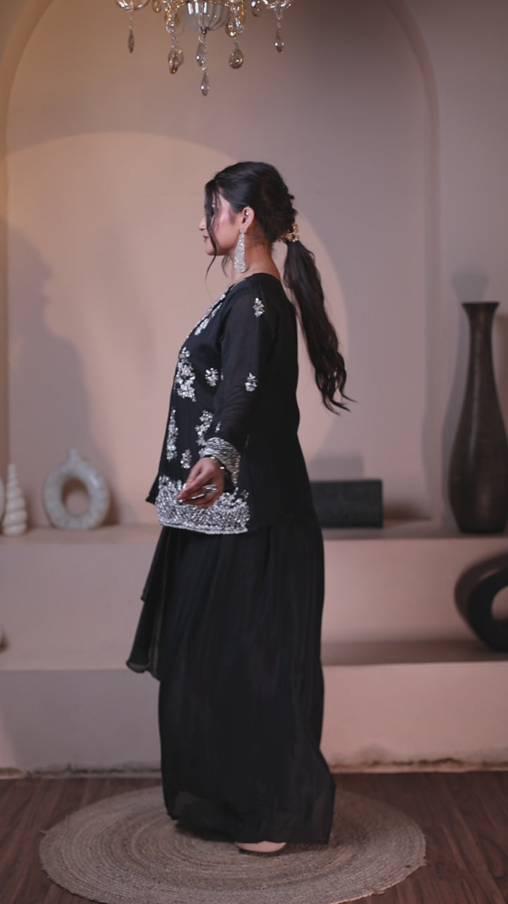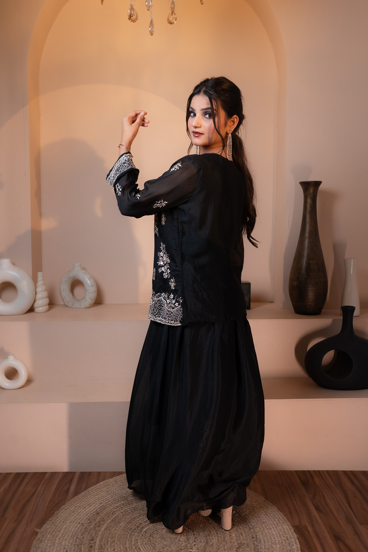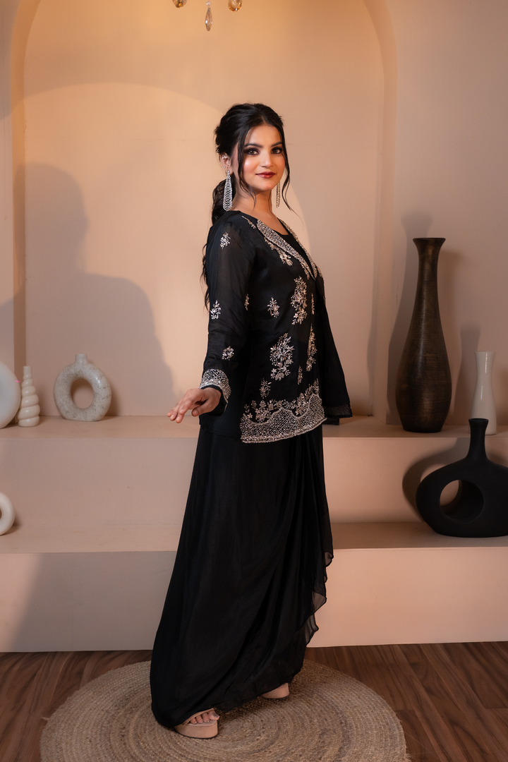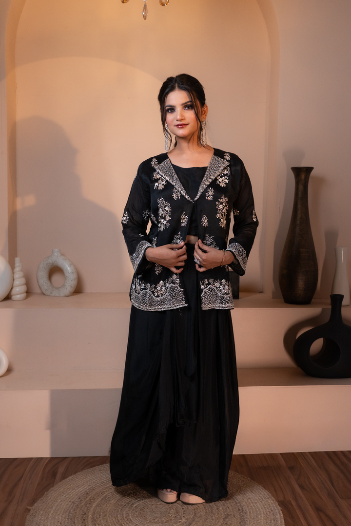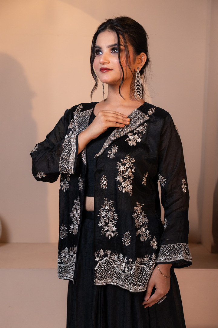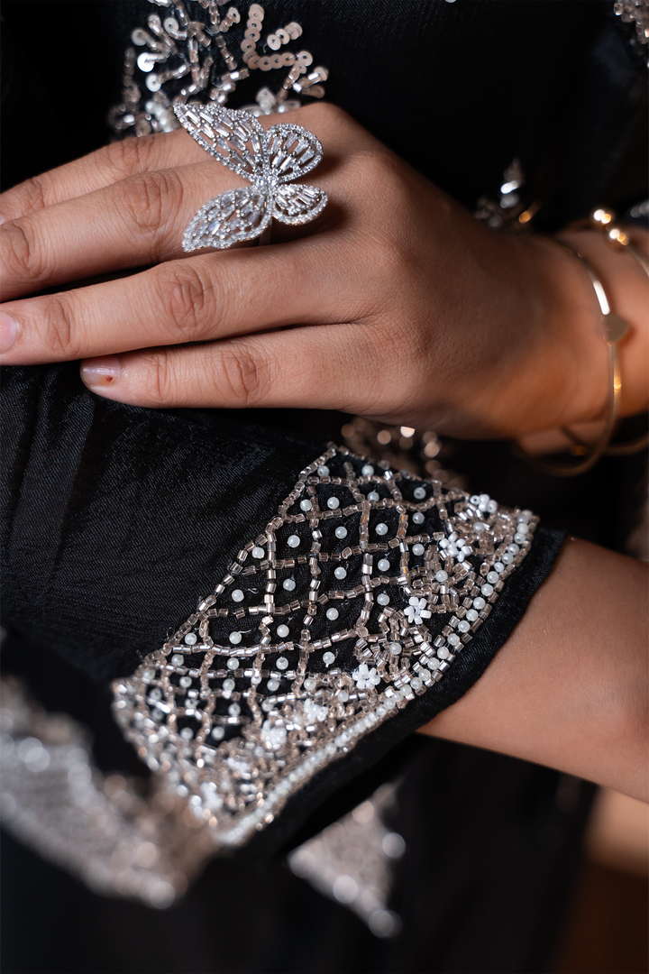 A homage to the beauty of tradition — Noor-e-Riwayat weaves together elegance, heritage, and modernity in one timeless silhouette. Crafted in deep noir black, this three-piece ensemble features a hand-embroidered jacket paired with a draped skirt and a sleek inner blouse. The intricate silver embroidery glistens subtly against the black canvas, creating a regal yet contemporary look for every festive soirée.