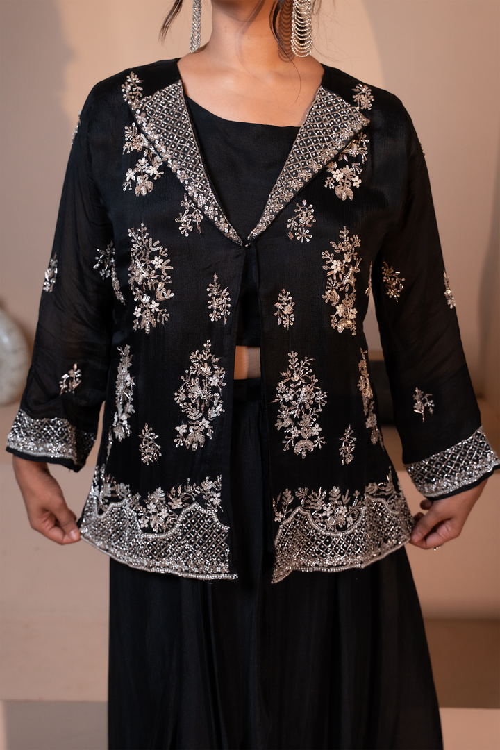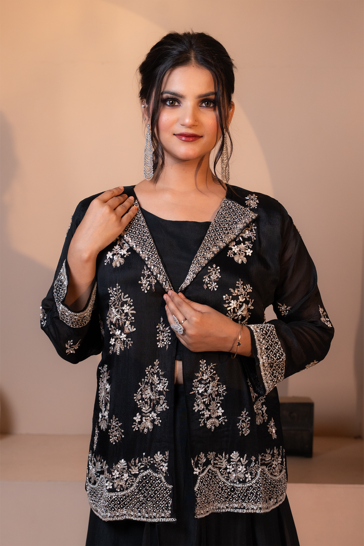 - Top: Full-sleeved embroidered jacket with sequin, zari & cutdana hand work.