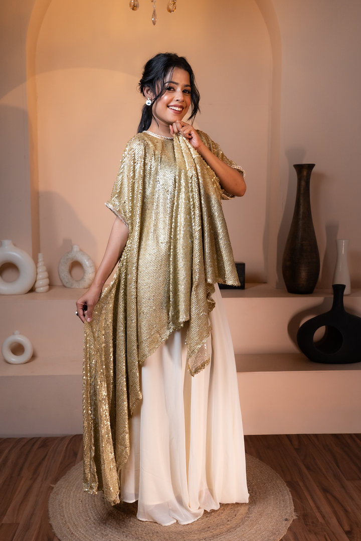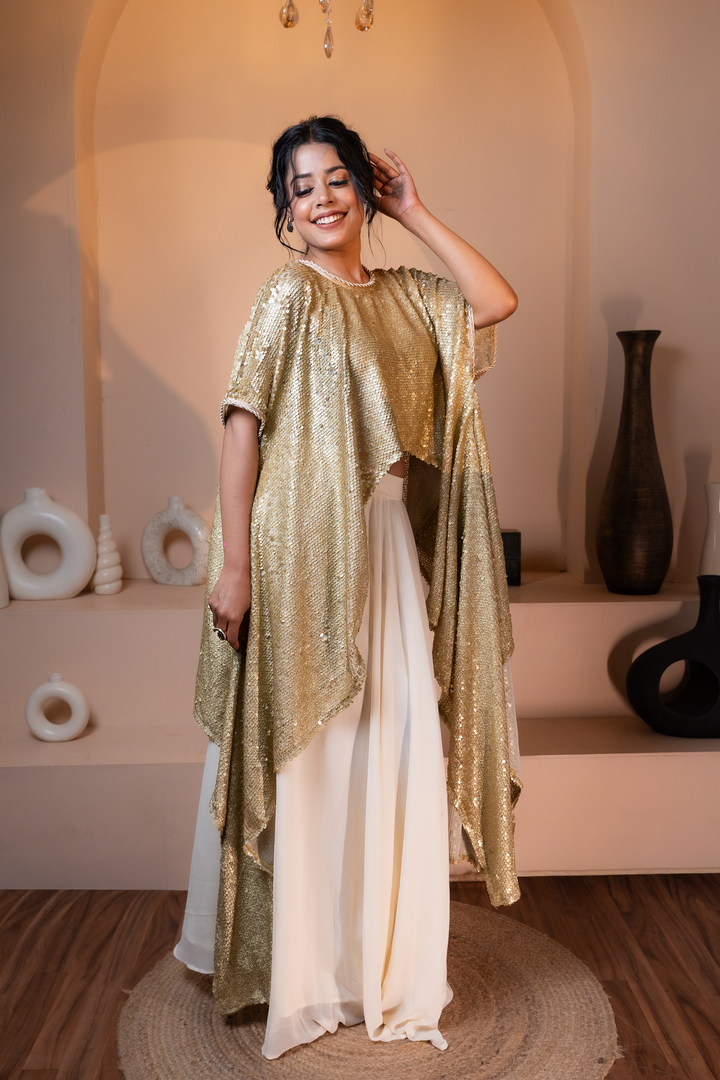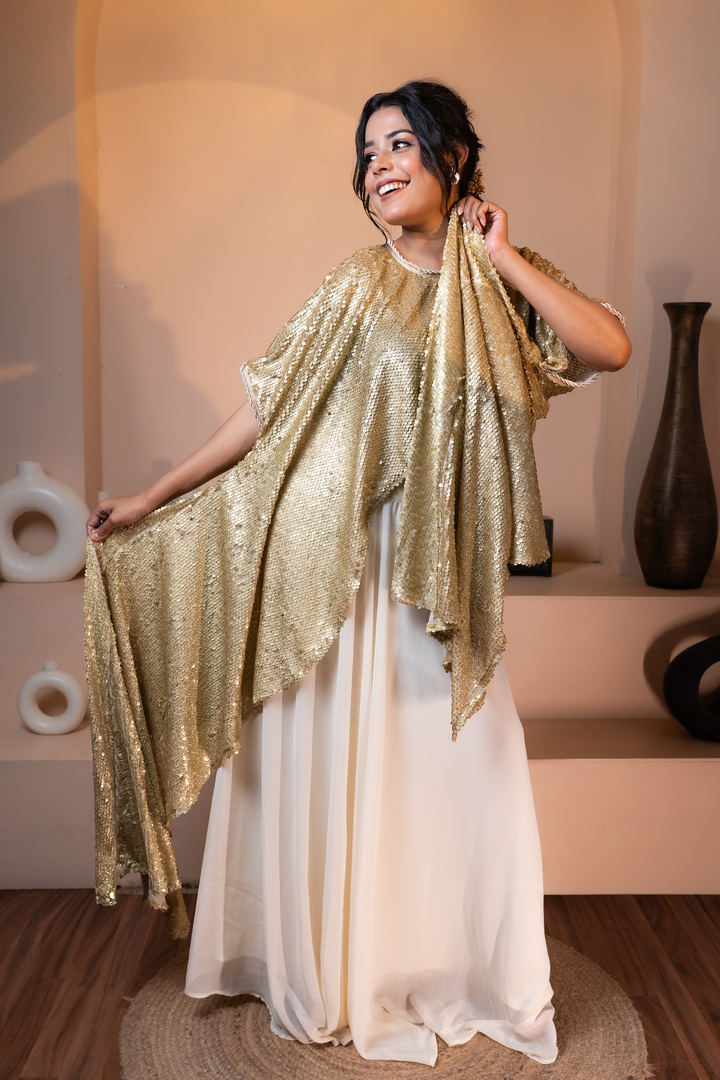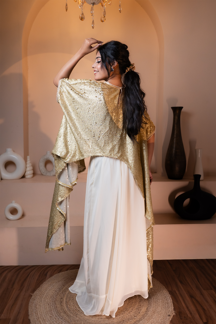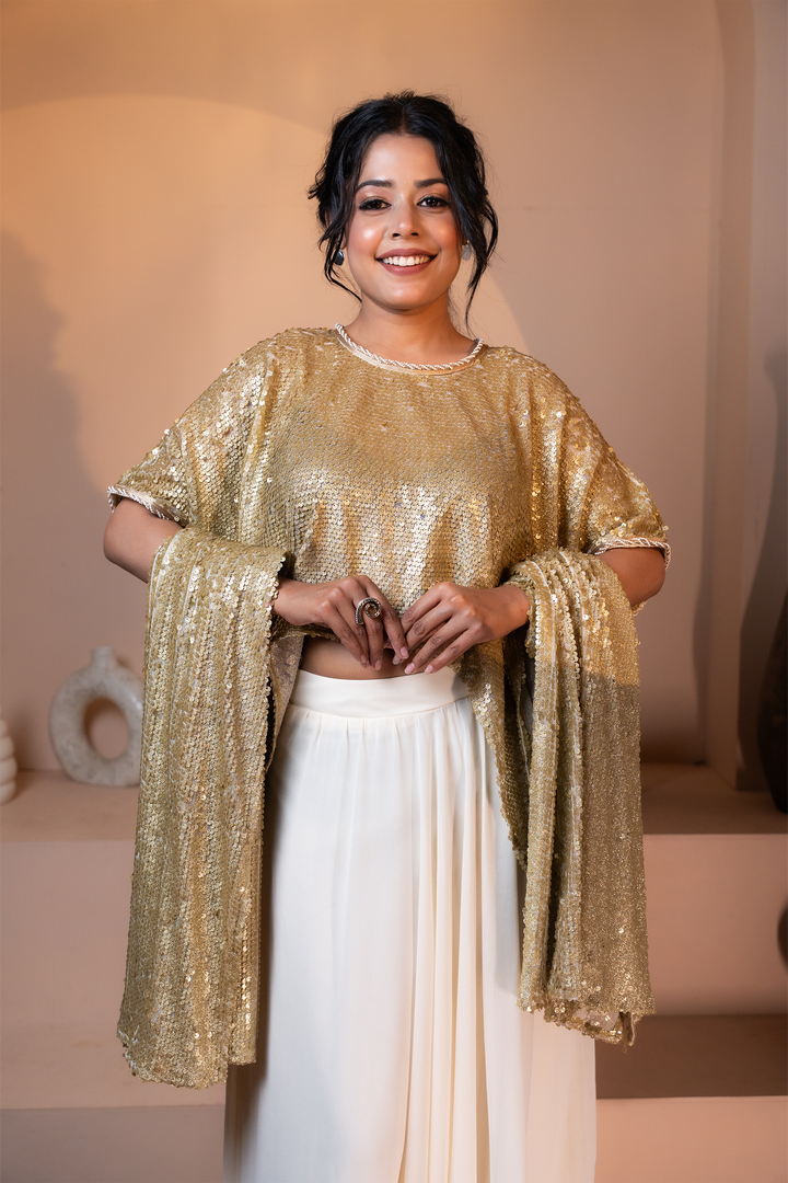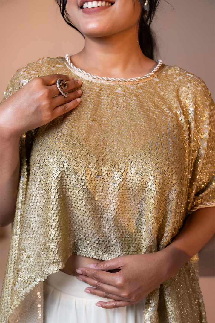 - Set Includes: Gold sequin cape top & ivory flared skirt lehenga
