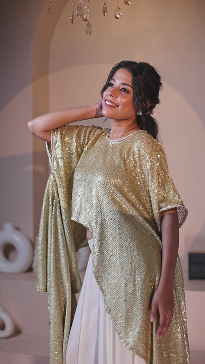 Where shimmer meets serenity — Noor-e-Zehr captures the essence of effortless festive glamour. This two-piece ensemble features a flowy gold sequin asymmetrical cape paired with ivory flared georgette skirt lehenga blending opulence with understated grace. The silhouette flows with fluid movement, making it the perfect pick for modern celebrations that call for timeless elegance.