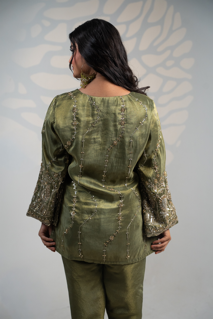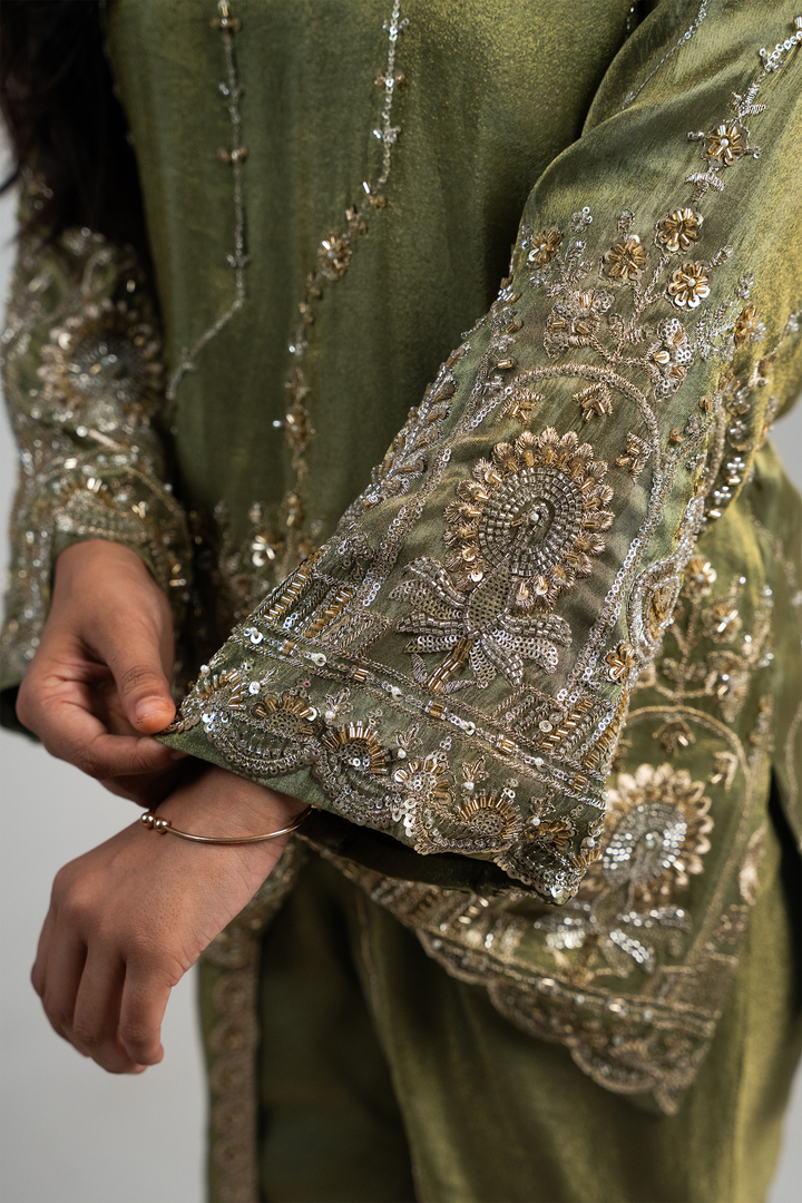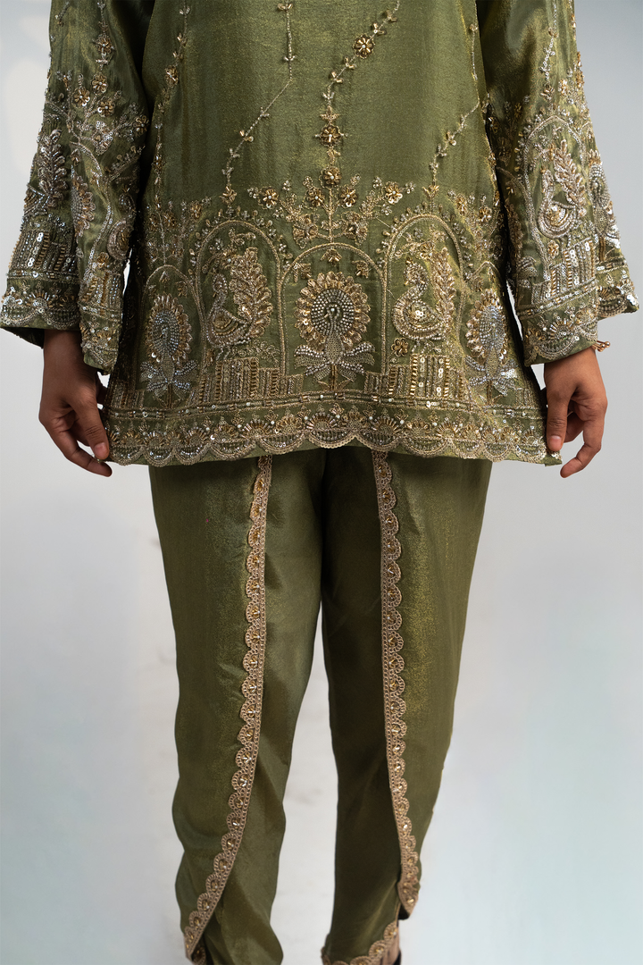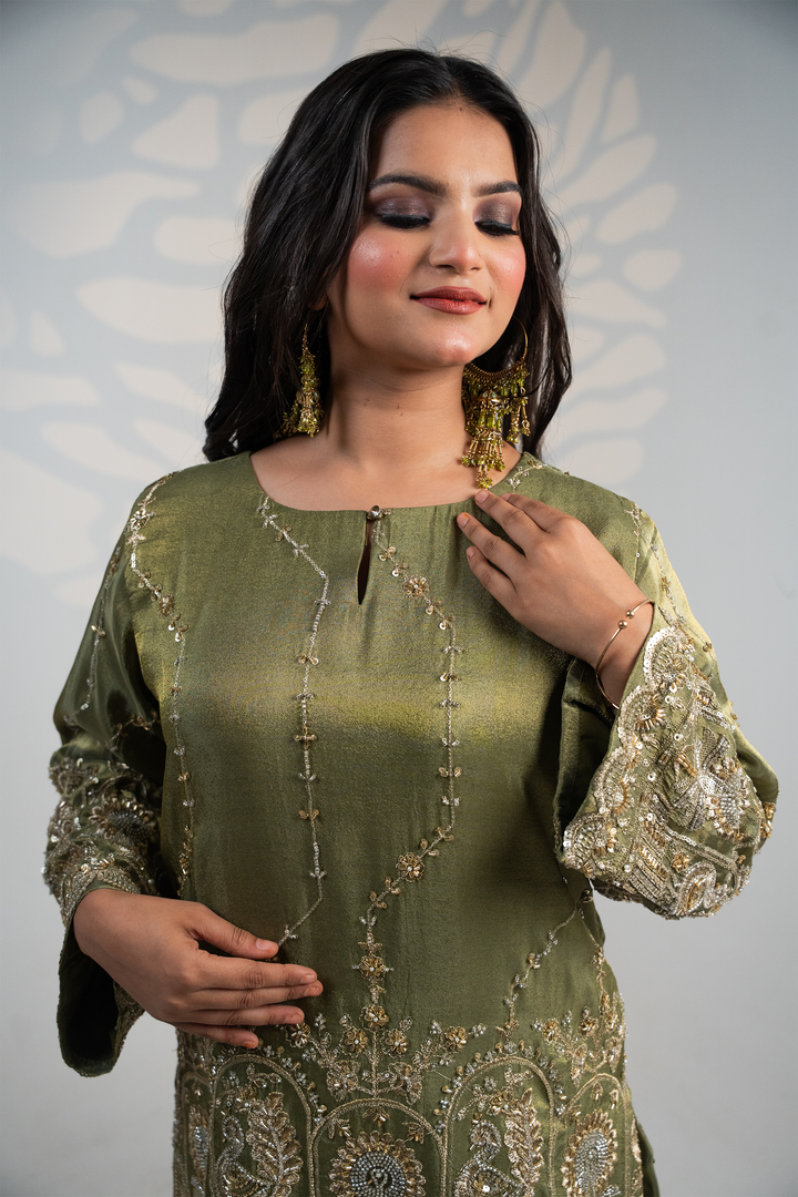 Step into timeless elegance with our Olive Regal Embroidered Set, a masterpiece crafted for festive evenings and special occasions. This two-piece ensemble features a luxurious olive green kurta adorned with intricate hand embroidery in gold and silver tones, highlighted with sequins, beads, and threadwork that add a regal charm. The delicate motifs of peacocks and florals on the hem and sleeves give it a rich, heritage-inspired appeal.