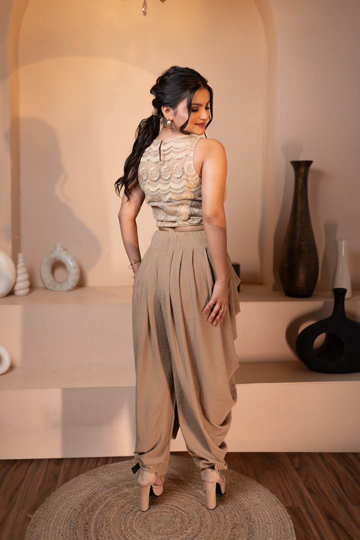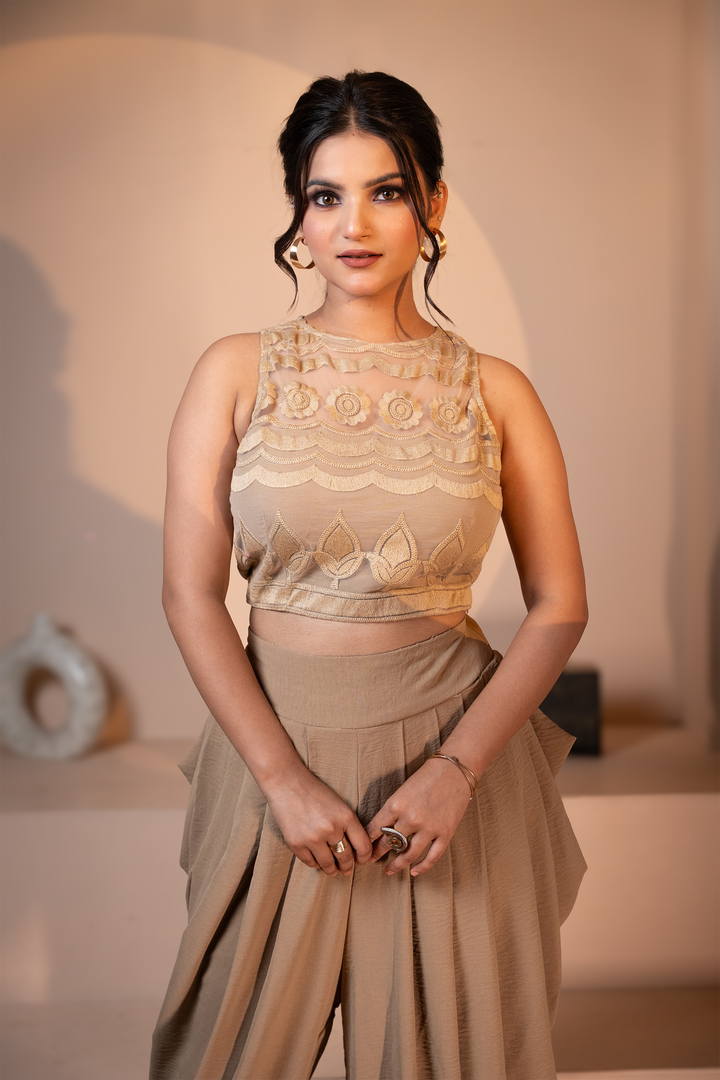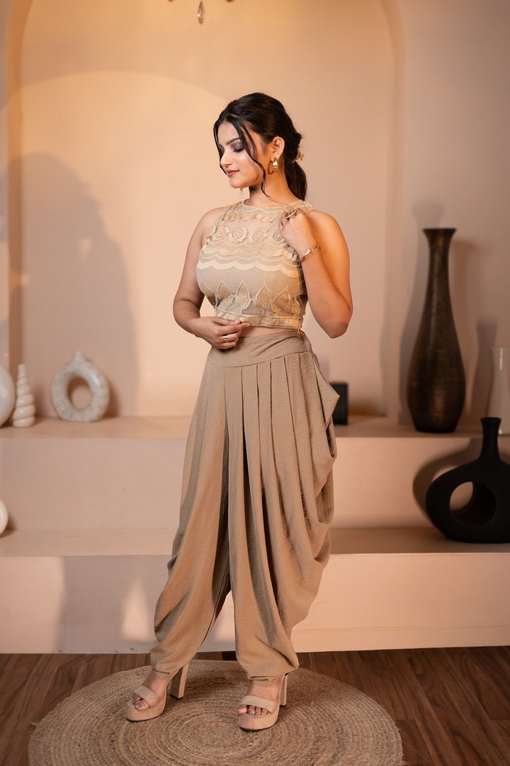 - Design: Crop top with illusion neckline paired with pleated dhoti pants