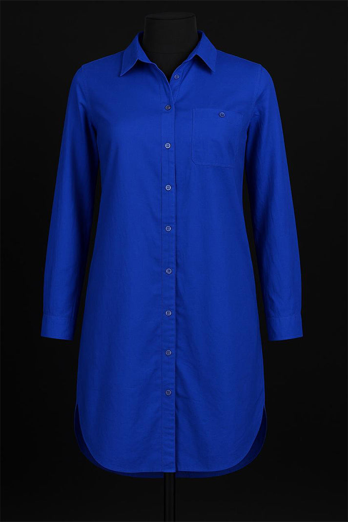 Command the day in bold color and sharp tailoring with our Azure Power Shirt Dress. Cut in a striking electric blue, this versatile piece fuses classic structure with modern ease. Featuring a pointed collar, button-down front, and a single pocket detail, it’s your go-to for smart dressing with zero fuss.