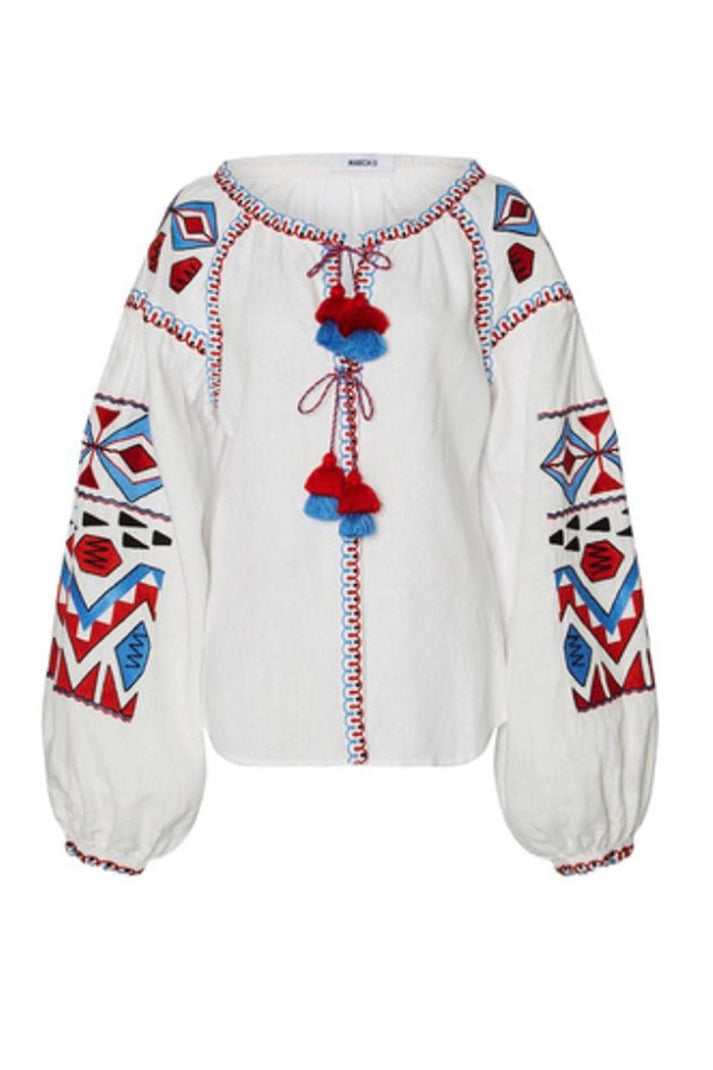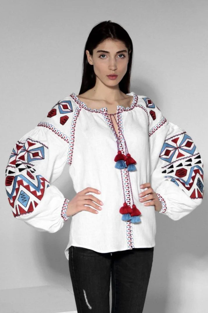 Celebrate heritage with a modern flair in The Boho Nomad Blouse — a vibrant expression of folk-inspired artistry. Handcrafted in a breathable ivory-hued fabric, this blouse features intricate geometric embroidery in striking red, blue, and black tones across the sleeves and neckline, creating a look that’s as wanderlust-worthy as it is timeless.