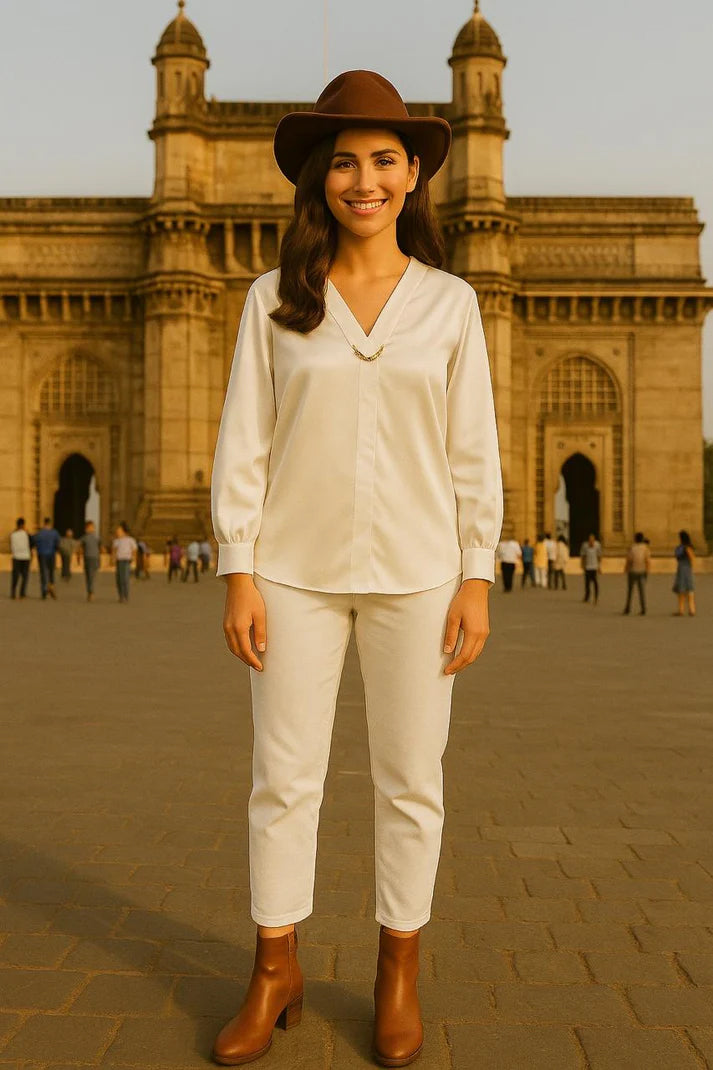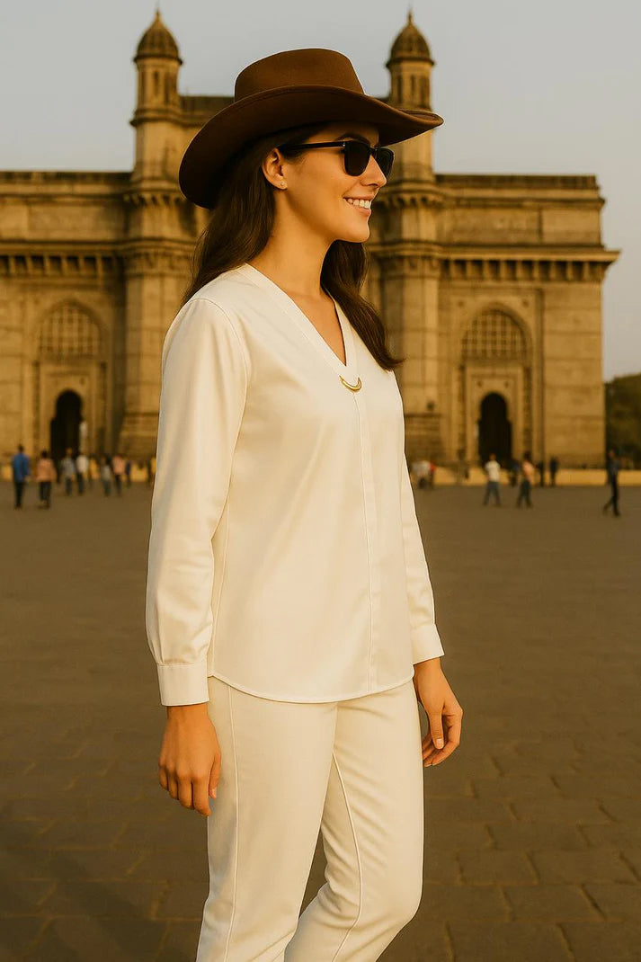 Style It With:Pair with straight pants for a monochrome moment, or contrast with a dark skirt or denims. Finish the look with sunglasses and a wide-brim hat for a timeless, travel-ready statement.
