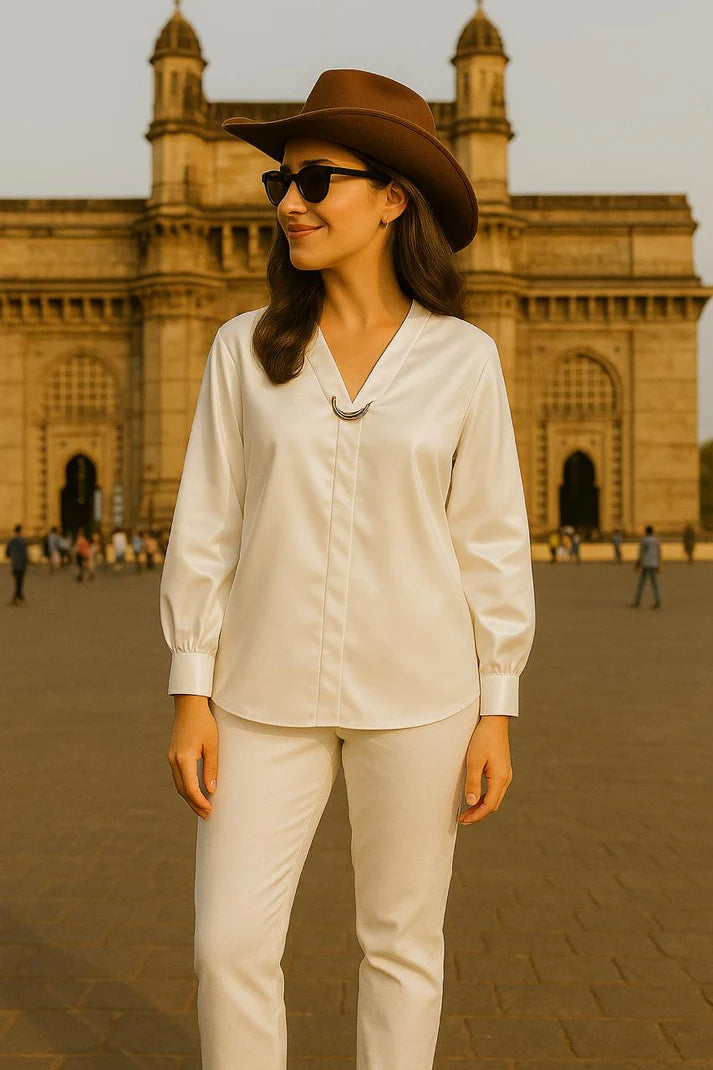 Effortlessly elegant and undeniably versatile, The Ivory Loop Shirt is your wardrobe’s new essential. Tailored from a luxe satin fabric, this shirt features a clean V-neckline accentuated by a unique metallic loop detail, adding a touch of contemporary charm. The full-length sleeves with structured cuffs lend a polished finish, while the relaxed silhouette ensures all-day comfort without compromising on style.