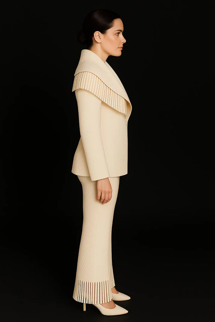 Bottoms: Matching ankle-length trousers with coordinating pleated texture and fringed hem, adding a playful yet elegant finish to the look.