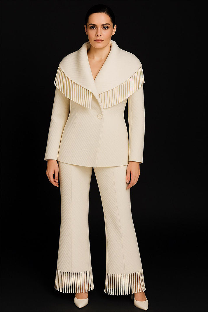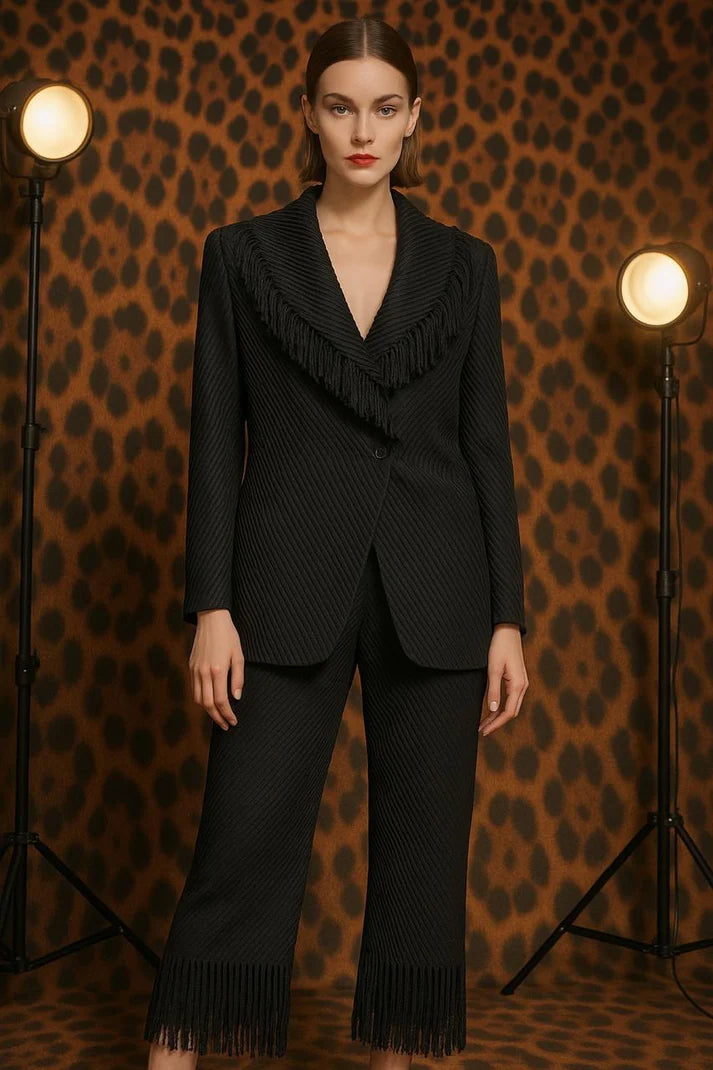 Top: A structured blazer-style top with a deep, shawl collar trimmed in bold fringe that cascades across the chest and shoulders. It has a tailored fit with a button closure, offering a sleek silhouette