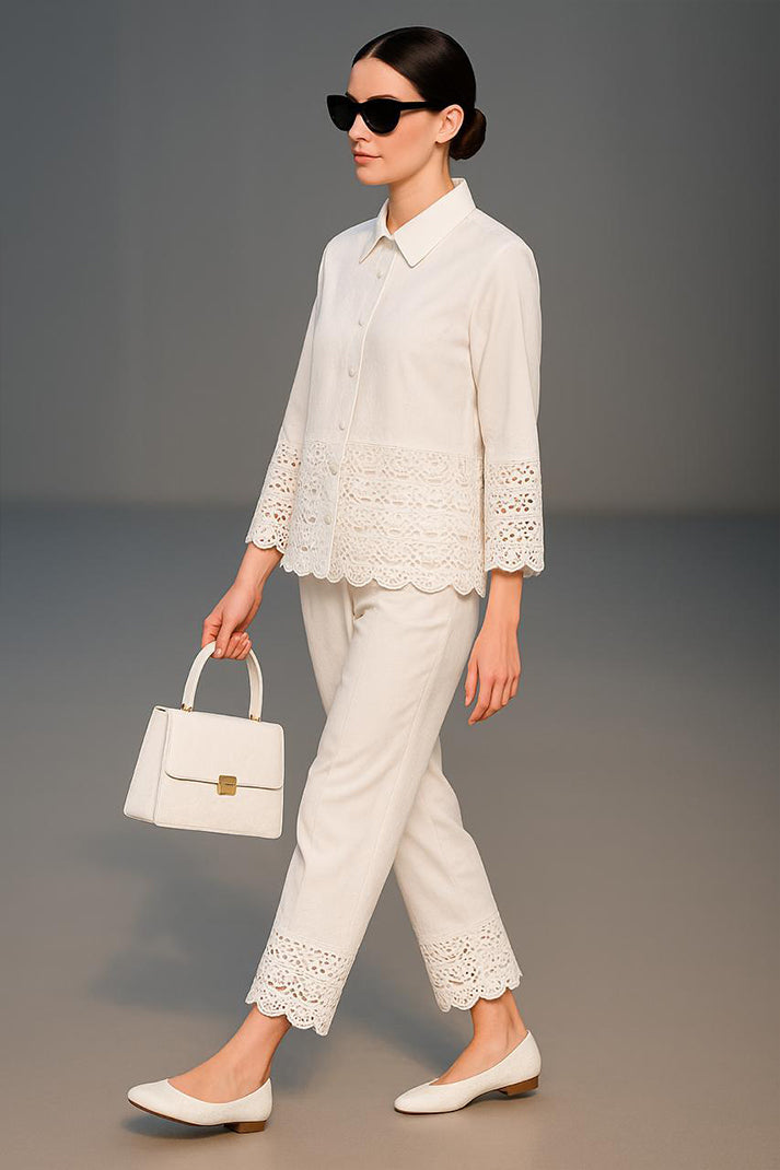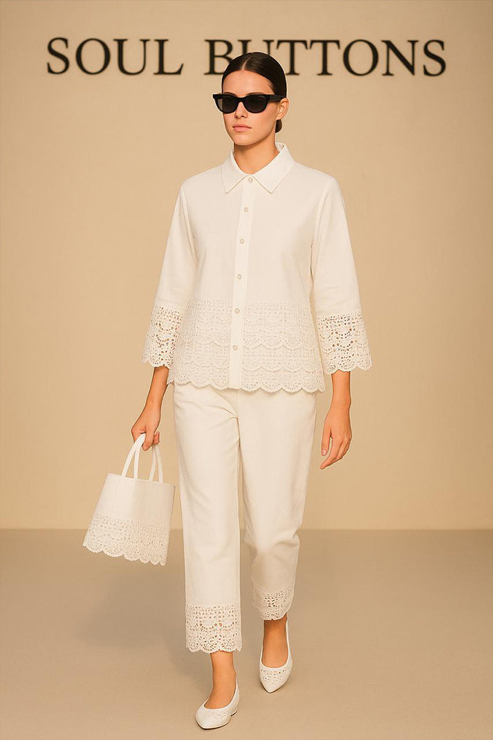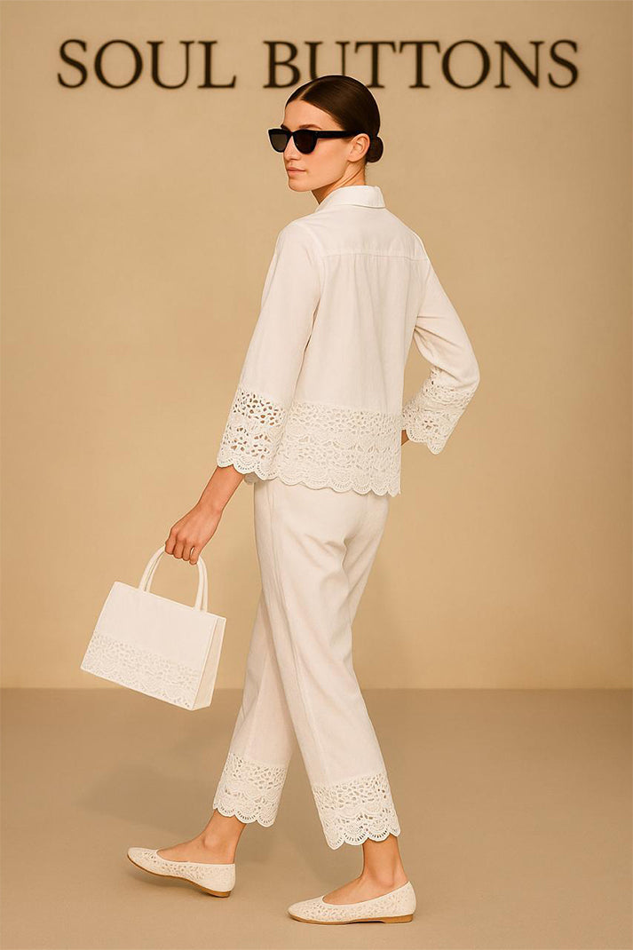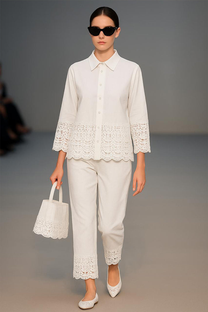 Classic structure meets artisanal charm in our Auré Lace Co-ord Set. Tailored from breathable premium cotton linen, this statement piece features delicate cutwork lace detailing at the hems and cuffs — finished with scalloped edges that lend a refined feminine flair. The crisp collared shirt pairs seamlessly with the ankle-length trousers, both elevated by coordinated embroidery and minimalist styling.