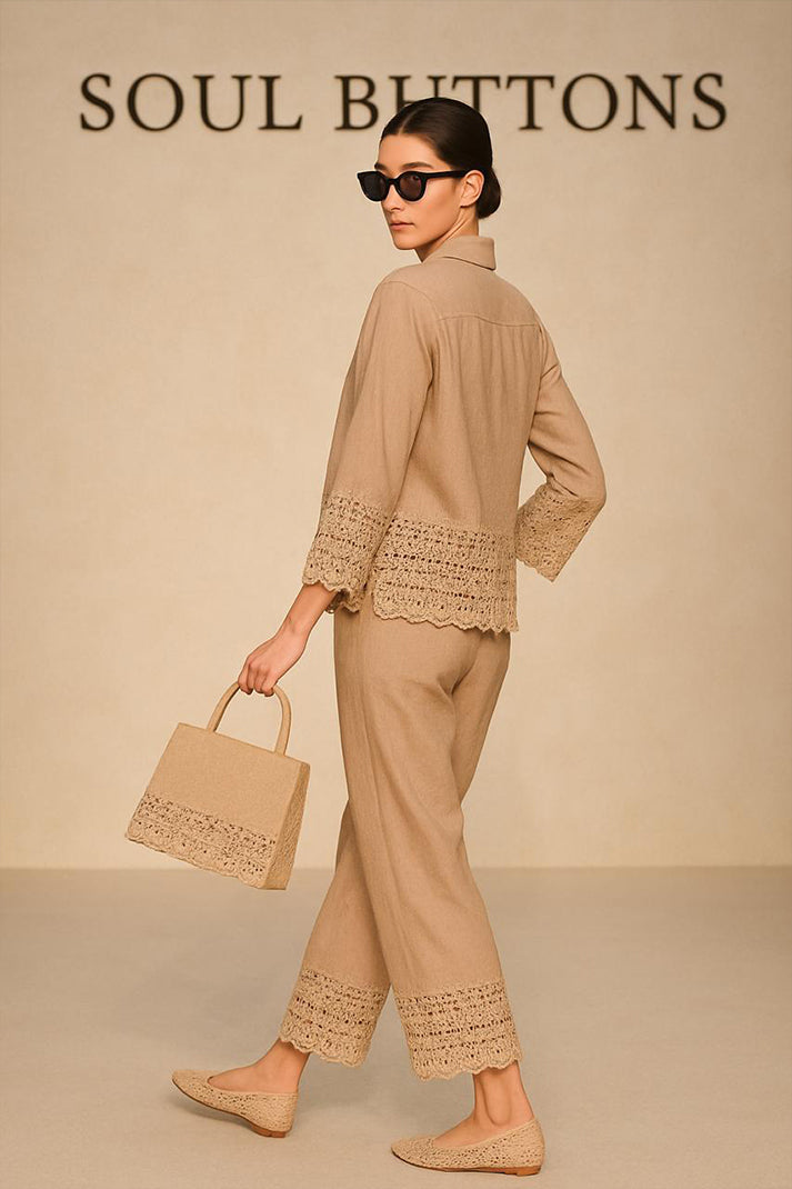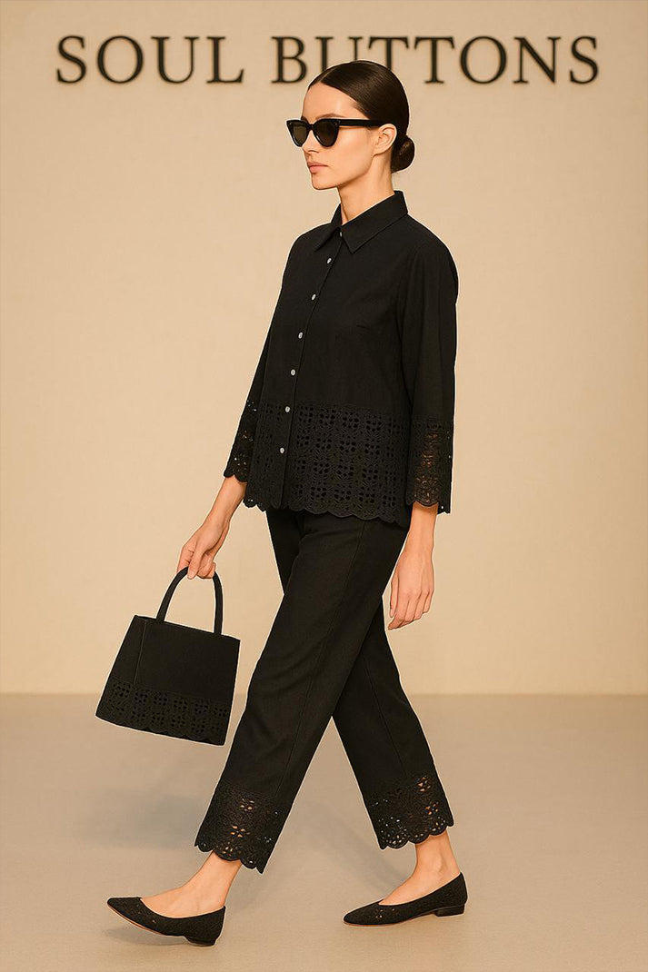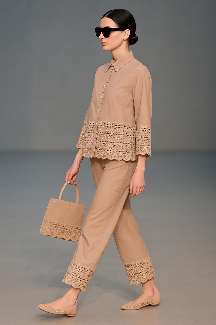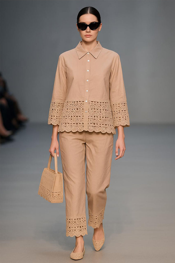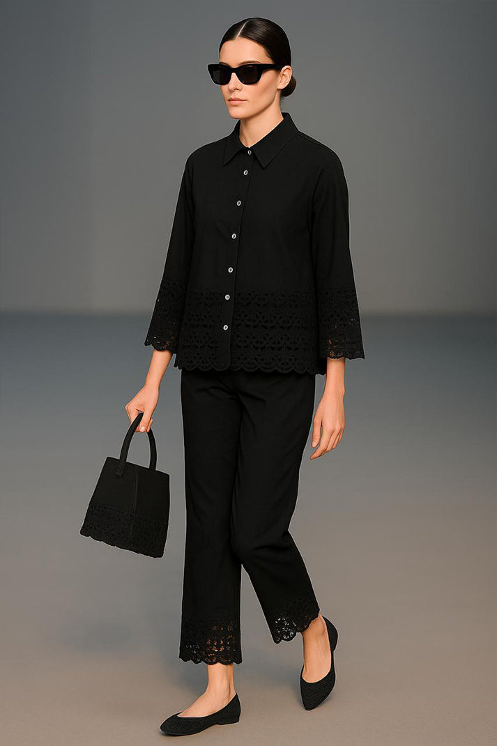 Classic structure meets artisanal charm in our Auré Lace Co-ord Set. Tailored from breathable premium cotton linen, this statement piece features delicate cutwork lace detailing at the hems and cuffs — finished with scalloped edges that lend a refined feminine flair. The crisp collared shirt pairs seamlessly with the ankle-length trousers, both elevated by coordinated embroidery and minimalist styling.