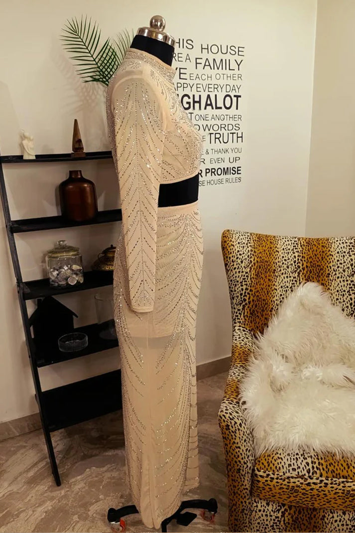 Command attention with our Golden Hour Dress / Co-Ord Set — a luxe blend of contemporary glamour and timeless elegance. Designed in a luminous nude-gold tone, this two-piece set features intricate sequin metal studs on the luxurious soft net fabric and detailing that cascades in soft, sculptural waves across both the crop top and skirt — giving the illusion of fluid motion and light.