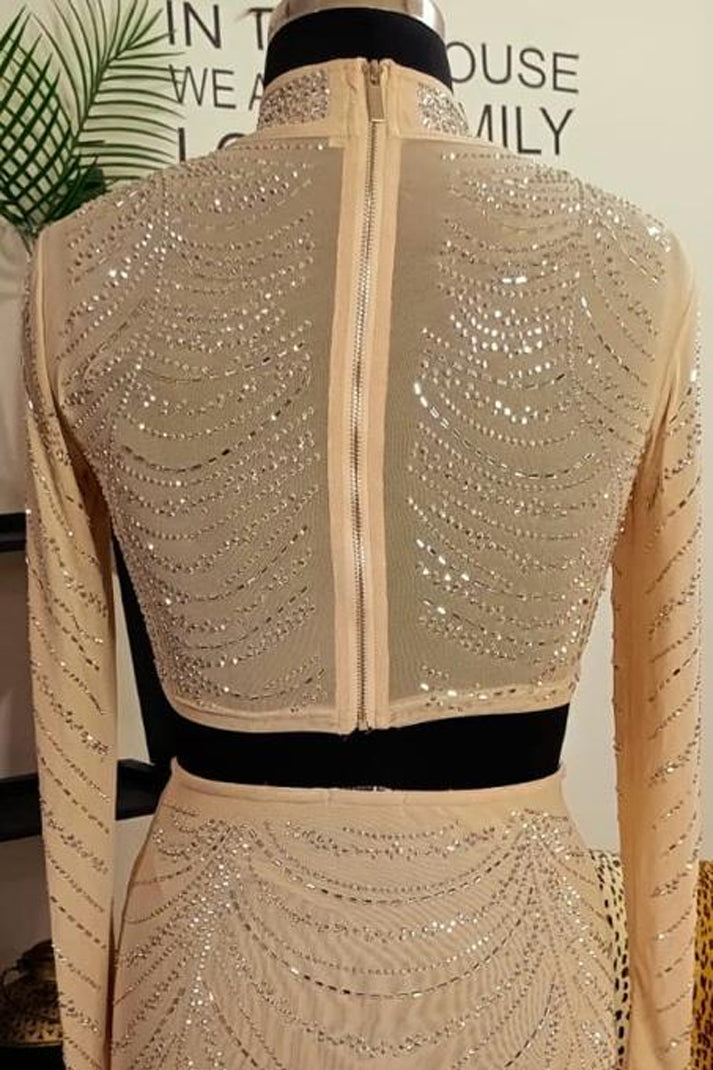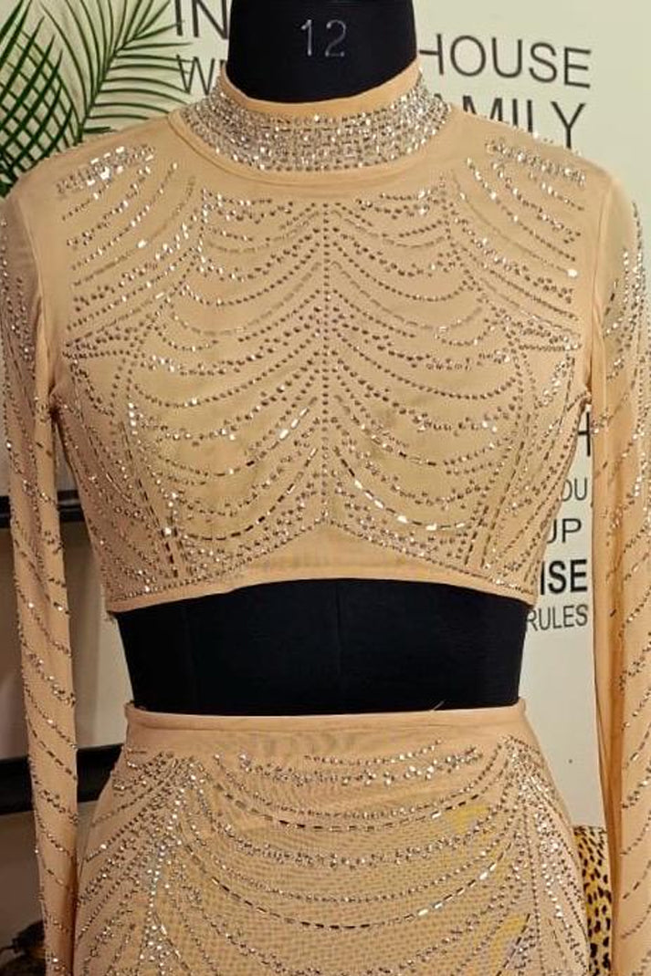 Top: High neckline, fitted silhouette with 3/4 sleeves, elevated by hand-embellished sequins/metal studs that shimmer with every move.