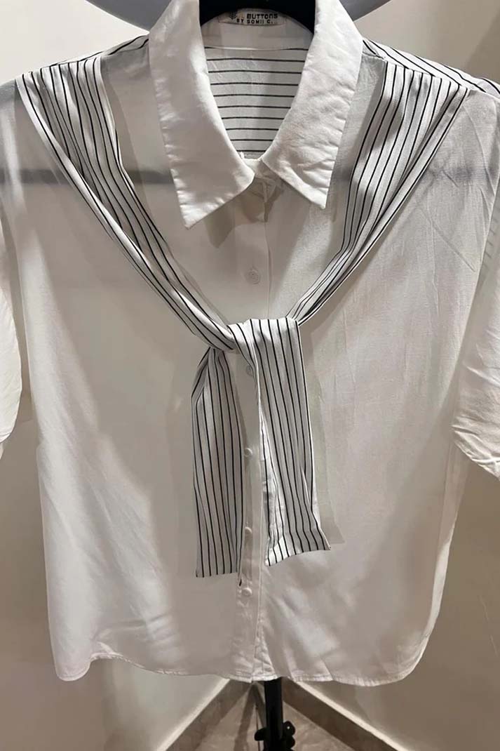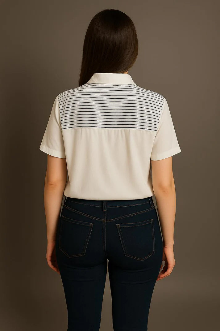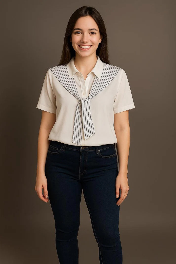 Channel breezy, European-inspired charm with The Riviera Polo Shirt — a perfect blend of effortless style and smart-casual ease. Designed in a soft ivory hue, this half-sleeve collared shirt comes with a detachable striped tie-up accent, styled here as a preppy drape over the shoulders. Whether worn plain or with the add-on detail, it adds character to your everyday look.