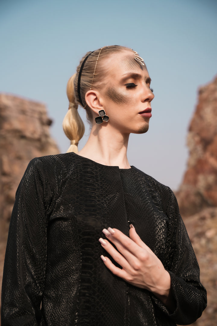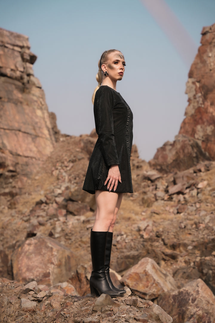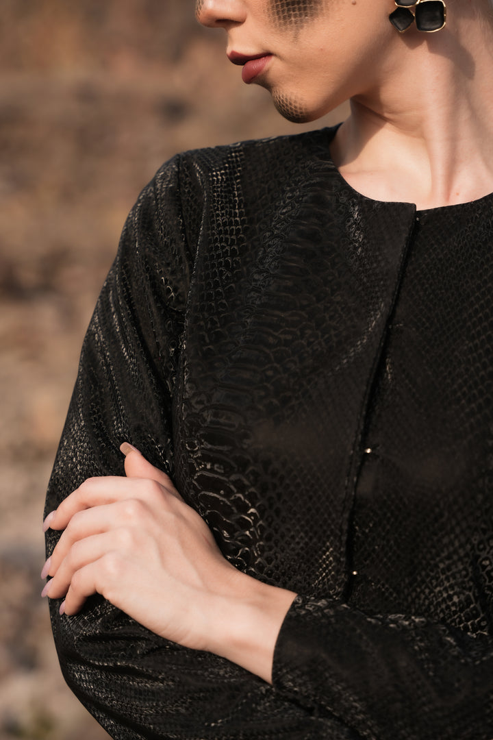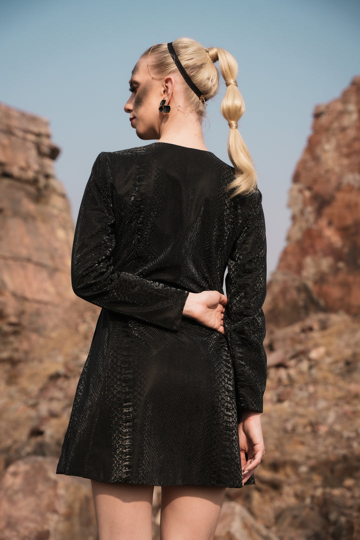 Sleek. Unapologetic. Powerful. The Night Serpent Dress/Jacket from HISS – The Serpent Edit is a modern statement of strength and sensuality. Crafted in obsidian-black faux leather with a subtle embossed snake pattern, this sculpted mini dresses the body in confidence.