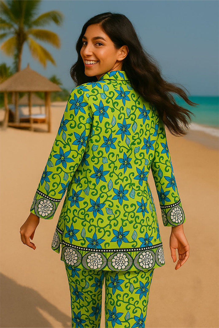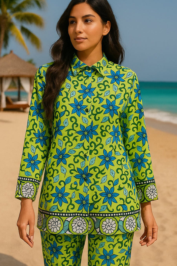 This vibrant co-ord set is a tropical showstopper from Soul Buttons, crafted in a lightweight satin-blend fabric with a glossy finish that drapes fluidly. The design features a lime green base adorned with bold royal blue floral motifs intertwined with deep green vines and delicate sky-blue leaves. Both the shirt and pants are bordered with an ornate white lotus and geometric motif panel, creating a striking visual frame.